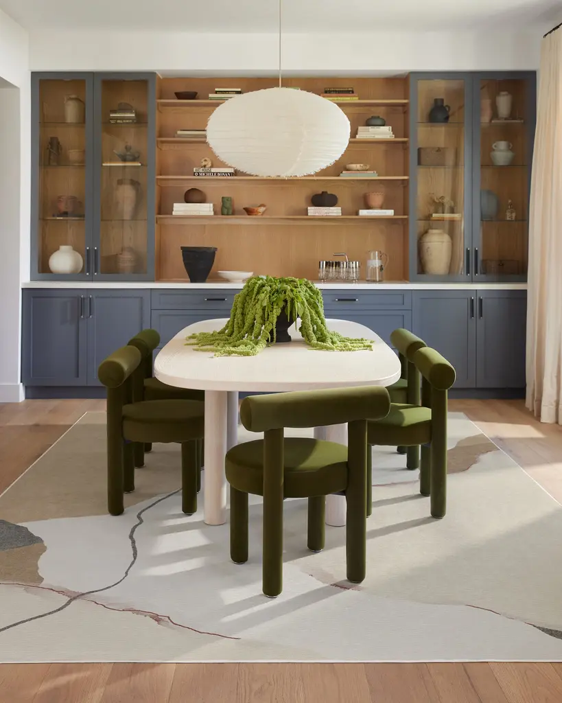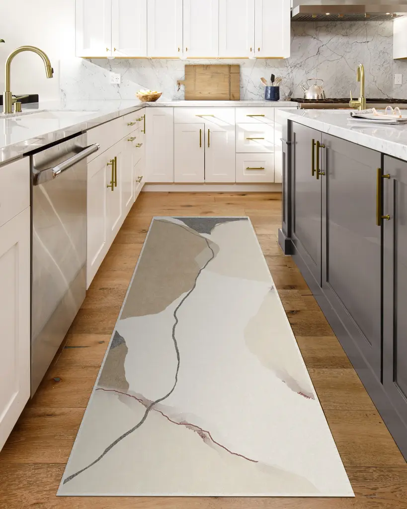 Subtle and stylish. Our Nina Takesh Loire Ivory Quartz Rug features an abstract swirl of shapes and lines in cream, dark grey, off-white, and deep dusty rose. Water-resistant, stain-resistant, and machine-washable.