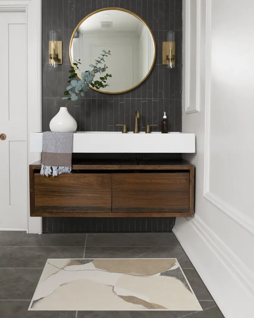 Subtle and stylish. Our Nina Takesh Loire Ivory Quartz Rug features an abstract swirl of shapes and lines in cream, dark grey, off-white, and deep dusty rose. Water-resistant, stain-resistant, and machine-washable.