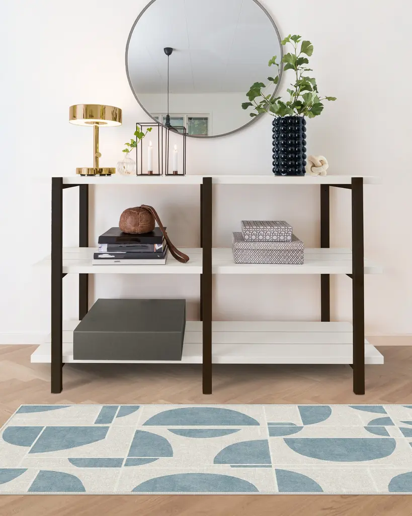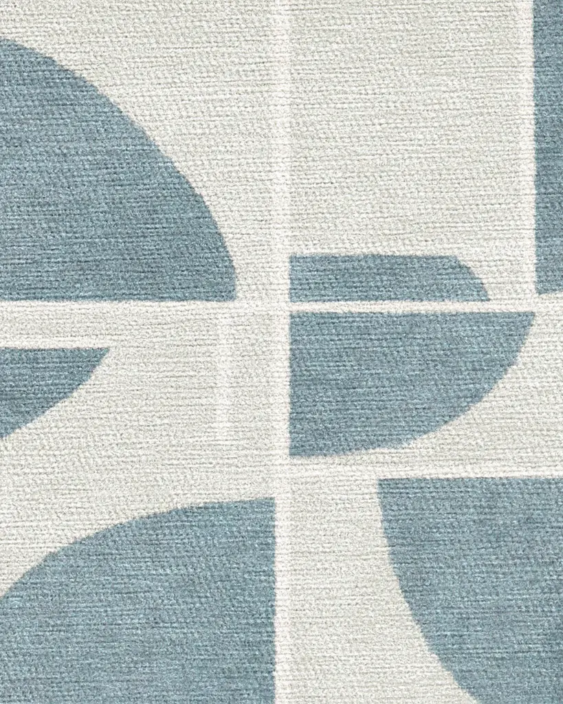 Dreamy like the night sky. Our Nina Takesh Lune Slate Blue Rug was designed with the lunar phases in mind and features light grey-blue circular shapes and lines interacting with each other on a soft pearly grey background. Water-resistant, stain-resistant, and machine-washable.