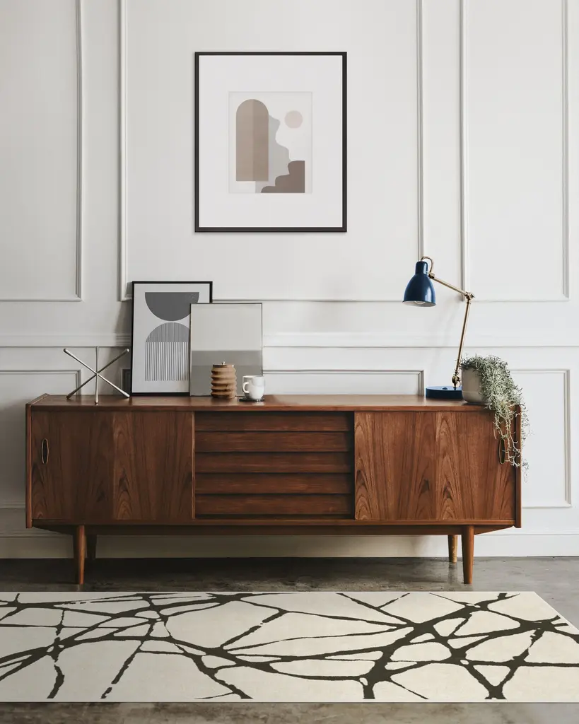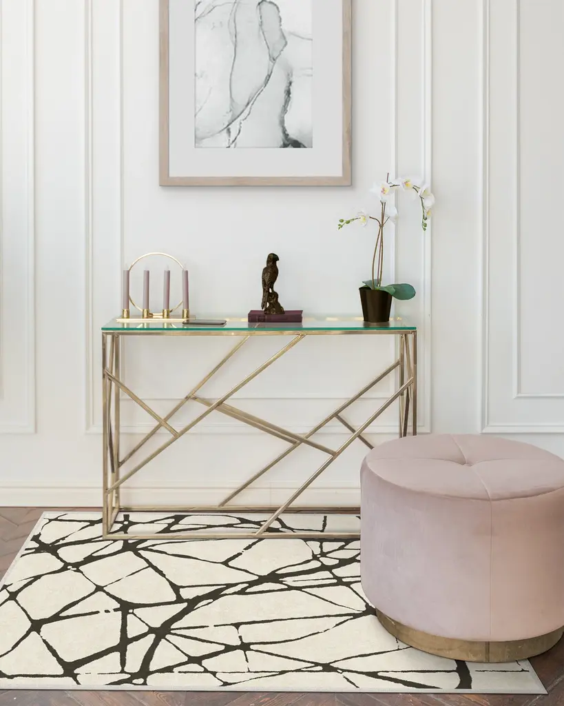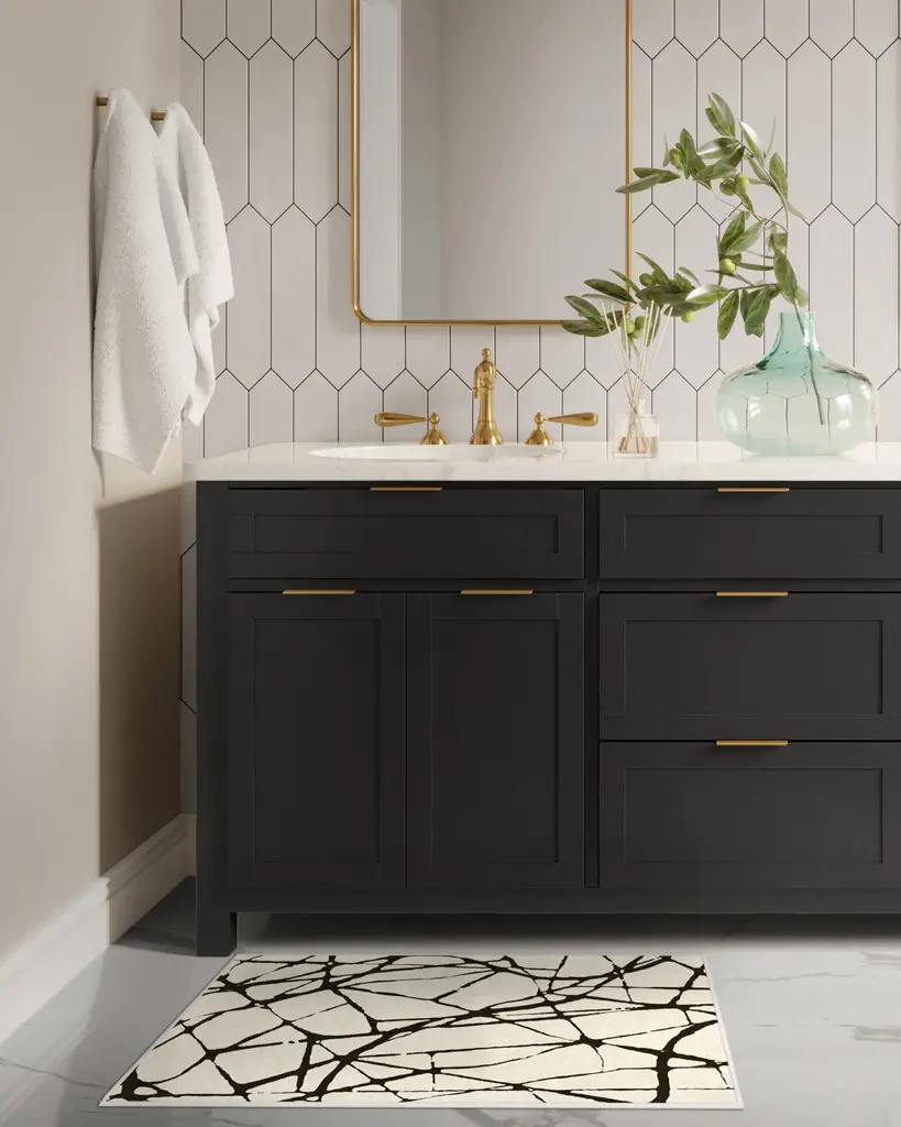 J'adore Paris. Our Nina Takesh Marion Black and Ivory Rug is inspired by the busy streets of the City of Lights. The contrasting shades allow the line work to pop, making this an elegant statement piece for any room. Water-resistant, stain-resistant, and machine-washable.