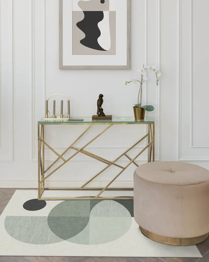 Find balance and harmony in your home. Our Nina Takesh Villette Rug, named after the French village, is inspired by iconic art deco designs and features bold, overlapping geometric shapes. The green color palette transitions from light sage to hunter green on a pearly white background. Water-resistant, stain-resistant, and machine-washable.