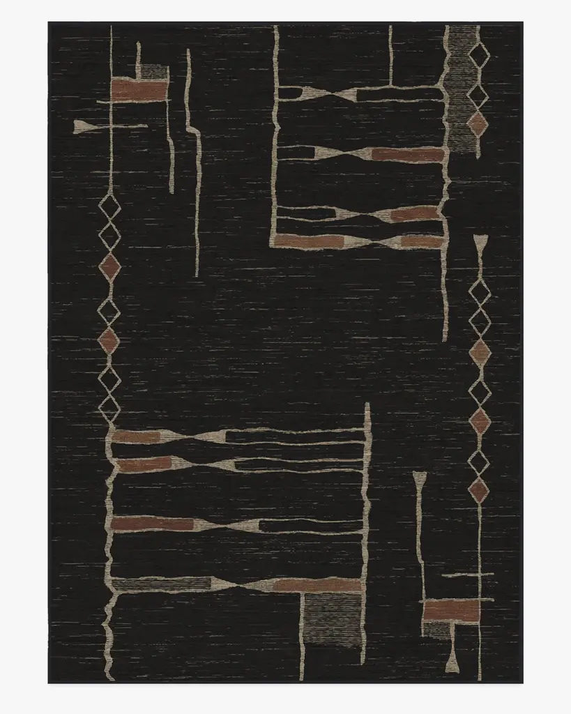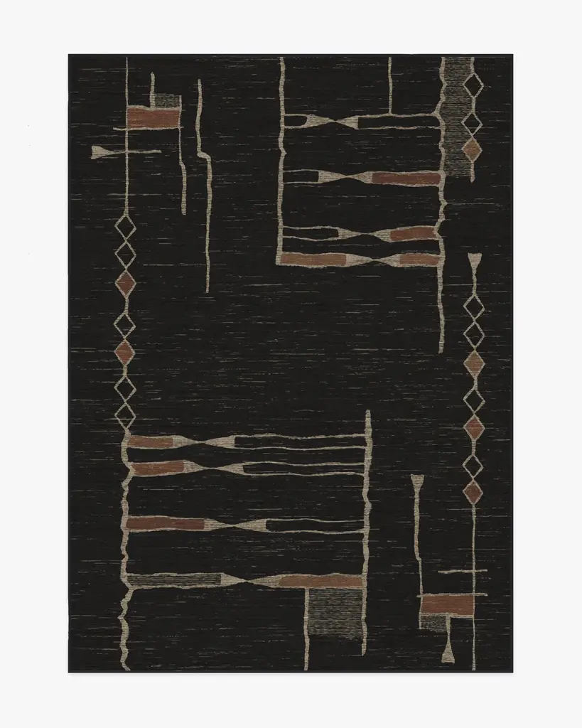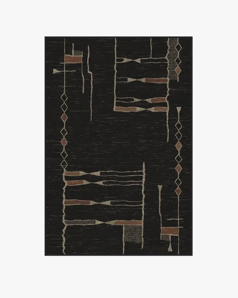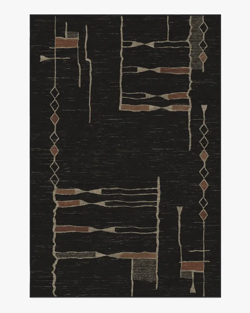 Discover the moody side of Moroccan design with our Architectural Digest Nisa Ink Black Rug, designed by Hema Persad. Rich, sexy, and cozy, this style draws inspiration from Beni Ourain Moroccan rugs, and features authentically organic line work and asymmetric patterns. Rustic earth tones against a dark charcoal background bring a touch of warmth to any room. Water-resistant, stain-resistant, and machine-washable. Rug colors may vary slightly according to your device and the lighting in your space.