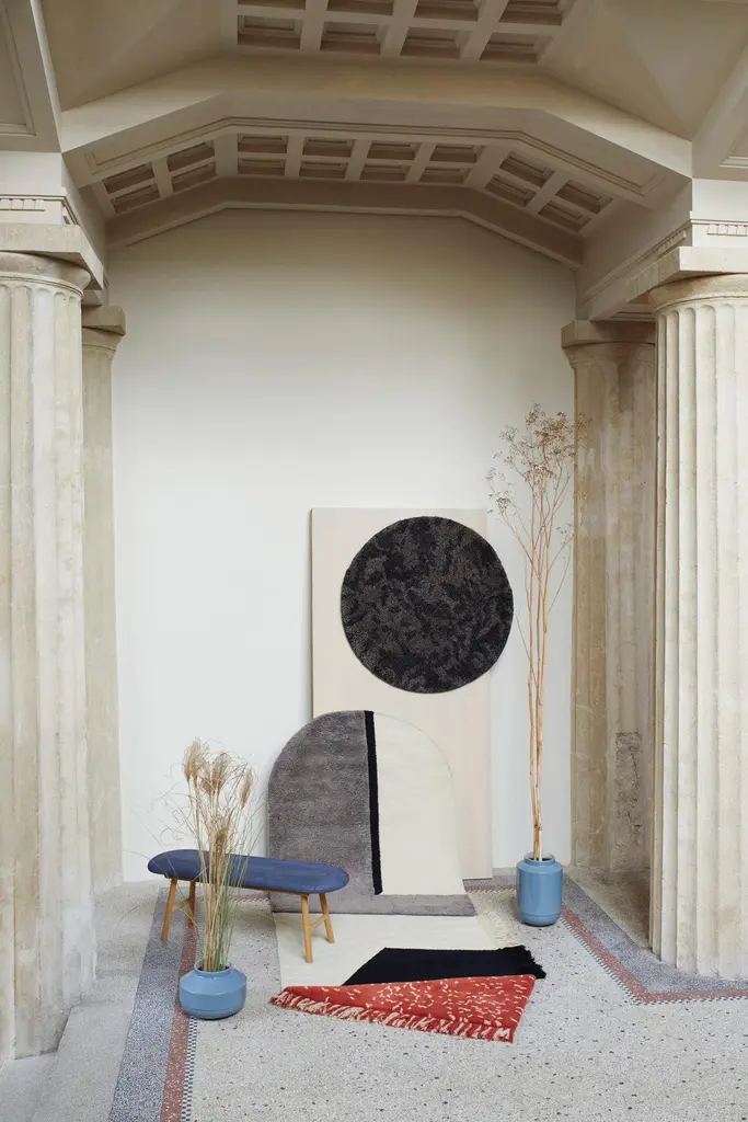 No. 1 Freeplay hand knotted rug ensemble by Lyk CarpetDimensions: L 180 x H 260 cm.Materials: 100% handspun, Tibetan highland new wool, obtained from living sheep, traditionally vegetable-dyed, pot-dyed.hand knotted manual techniques and pot-dying makes every Lyk Carpet unique, slight variations in Size & tone is possible. Available in different colors. Wall and floor objects of freePlay #1 – #6 are sets of freeplay modules composed by the designer Mareike Linau as seen here in set number #1. The individual modules or bodies can be freely arranged and fixed to each other. The main bodies are made in the flat weave techniques Soumak, Dari and Panama. Accents are set by fringed and fluffy additional bodies which enrich the design. The image of the carpet becomes modular.100% Wool objects provide visual warmth & reduce unwanted reverberation!Mareike Lienau designs carpet objects and unique carpets for her label Lyk Carpet, which are hand knotted in Nepal. Her Mission is to reinterpret Craft and to bring it closer to young people. The superficial functionality of the She tries to radically question the superficial functionality of the carpet. Away from the rectangle Mareike wants to positive, lustful and imaginative the form & the Craft, the Material new, unseen and exaggerated show.Her approach asks: ‘What is contemporary about Craft?‘ ,“Many people don’t really relate to products anymore. Mass production has led to today’s throwaway society. I want to contribute to raising people’s awareness, prompting them to think about products: how they are made and the resources involved; to generate values. I decided to do this through supporting the preservation of a cultural heritage, and by designing authentic objects. Contemplating and experiencing this artistic Craft leads to new insights and points of view and enriches communication.With my textile posters and Pouf_Characters for example I am inviting people to ac- quaint themselves with a value creation chain, and to think about global responsibility.“.