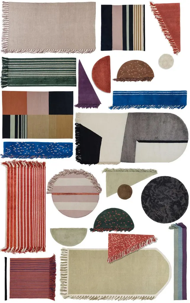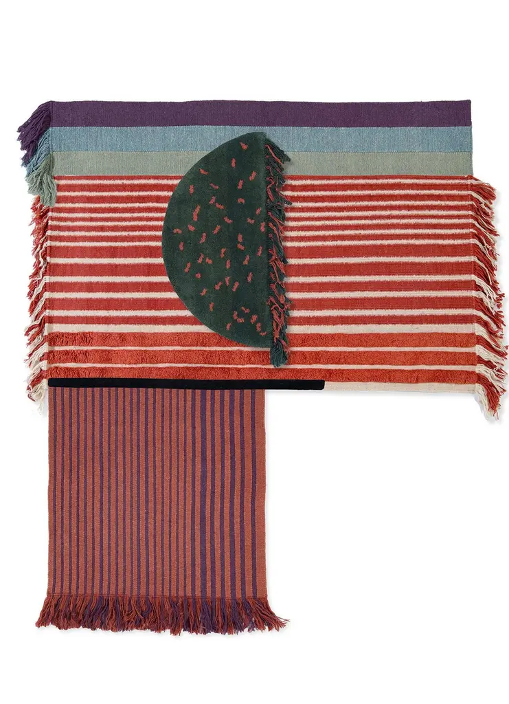 No. 4 Freeplay hand knotted rug ensemble by Lyk CarpetDimensions: L 260 x W 180 cm.Materials: 100% handspun, Tibetan highland new wool, obtained from living sheep, traditionally vegetable-dyed, pot-dyed.hand knotted manual techniques and pot-dying makes every Lyk Carpet unique, slight variations in Size & tone is possible. Available in different colors. Please contact us.Wall and floor objects of freePlay #1 – #6 are sets of freeplay modules composed by the designer Mareike Linau as seen here in set number #1. The individual modules or bodies can be freely arranged and fixed to each other. The main bodies are made in the flat weave techniques Soumak, Dari and Panama. Accents are set by fringed and fluffy additional bodies which enrich the design. The image of the carpet becomes modular.100% wool objects provide visual warmth & reduce unwanted reverberation!Mareike Lienau designs carpet objects and unique carpets for her label Lyk Carpet, which are hand knotted in Nepal. Her Mission is to reinterpret Craft and to bring it closer to young people. The superficial functionality of the She tries to radically question the superficial functionality of the carpet. Away from the rectangle Mareike wants to positive, lustful and imaginative the form & the Craft, the Material new, unseen and exaggerated show.Her approach asks: ‘What is contemporary about Craft?‘ ,“Many people don’t really relate to products anymore. Mass production has led to today’s throwaway society. I want to contribute to raising people’s awareness, prompting them to think about products: how they are made and the resources involved; to generate values. I decided to do this through supporting the preservation of a cultural heritage, and by designing authentic objects. Contemplating and experiencing this artistic Craft leads to new insights and points of view and enriches communication.With my textile posters and Pouf_Characters for example I am inviting people to ac- quaint themselves with a value creation chain, and to think about global responsibility.“.