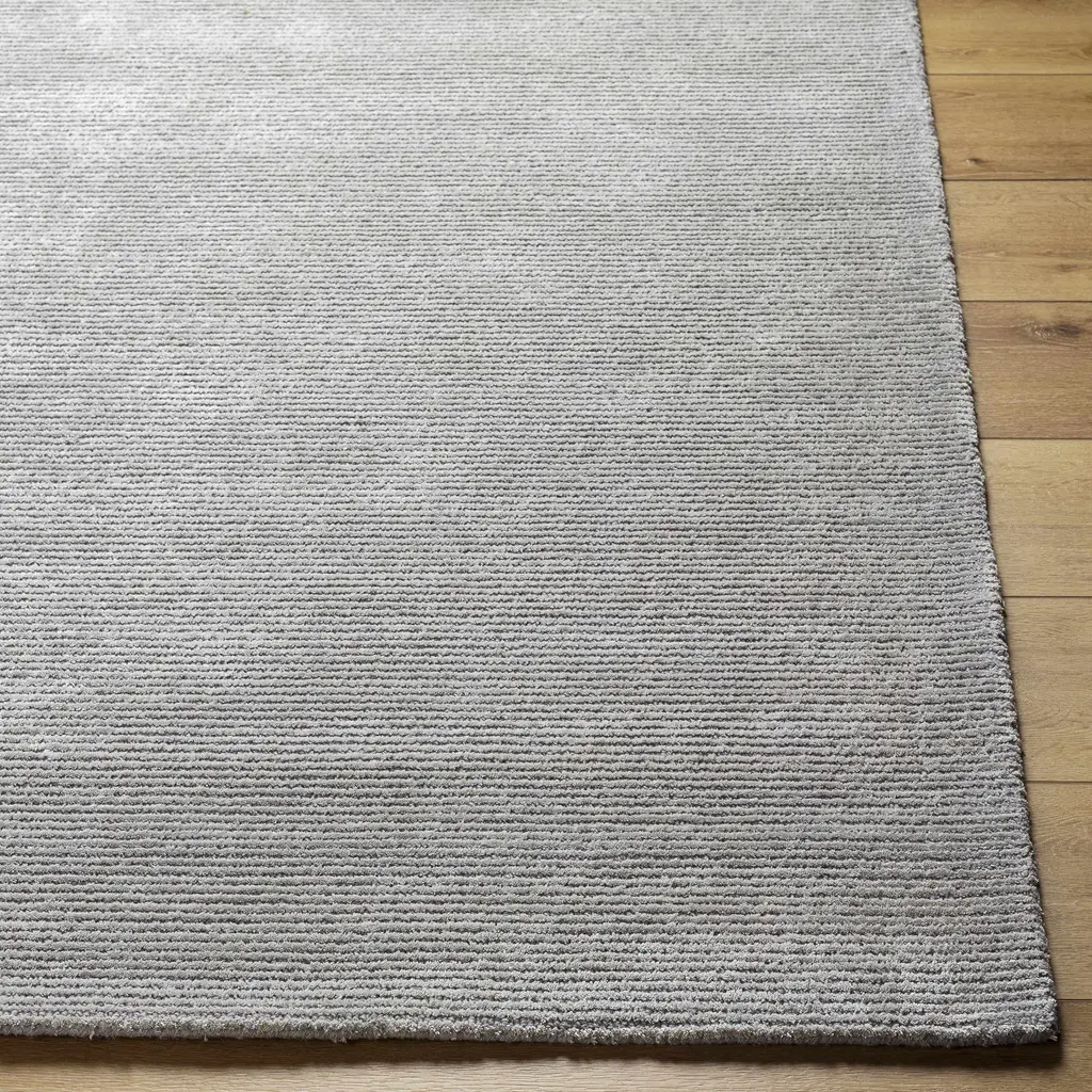 Collection: Noham Colors: Silver Gray, Pale Slate Construction: Hand Tufted Material: 65% Viscose,35% Wool Pile: Medium Pile Pile Height: 0.3" Styles: Contemporary Backing: Canvas Made In: India Thickness: 0.5" Price Range: $$$$$ (Affordable)