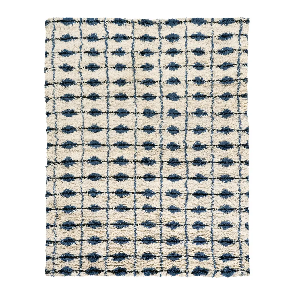 Sumptuous and shaggy, the Noma Handwoven Wool Rug has a plush pile of undulating ivory tufts with an ink-colored diamond design. The perfect rug for adding softness and style to a bedroom, living room, or family room.