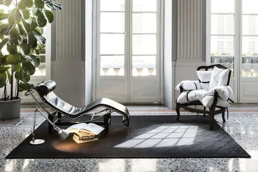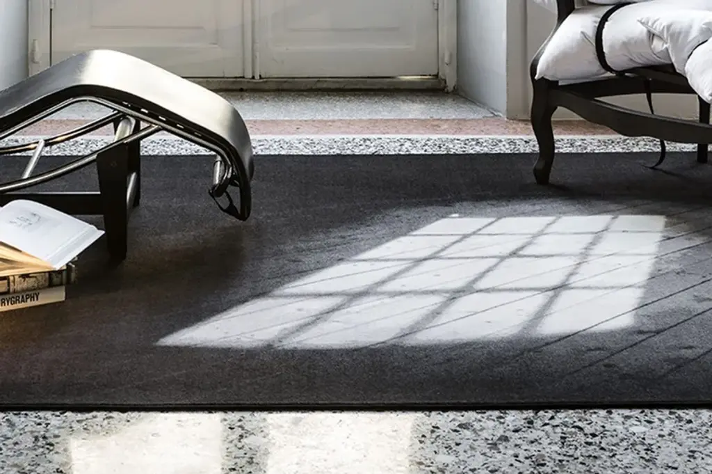 Noon is a rug made of 80% wool and 20% polyamide printed with a flush edge. “The sun comes in through the window, projects its shape onto the floor and illuminates a portion of the space. It lasts a few moments, until the light moves and creates other shapes and suggestions. This suspended moment has stopped, delicate and ephemeral like the passage of a shadow. So this poetic carpet gives the impression of always having a real reflection of light in the room.