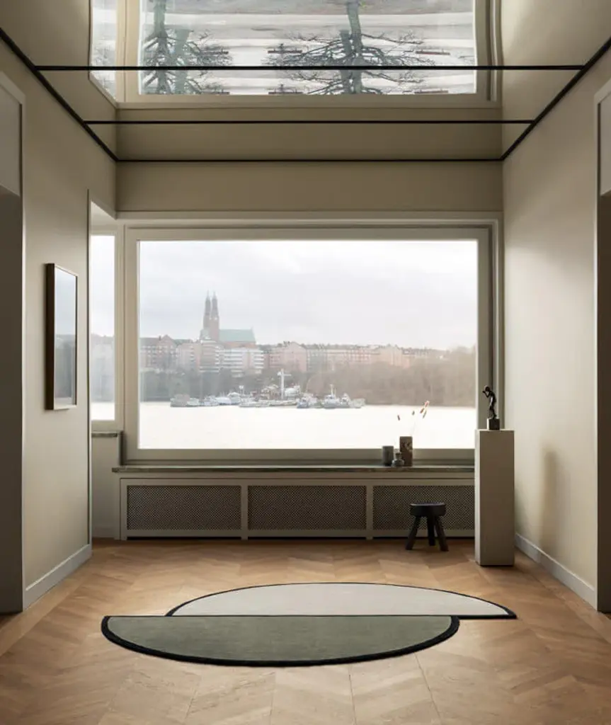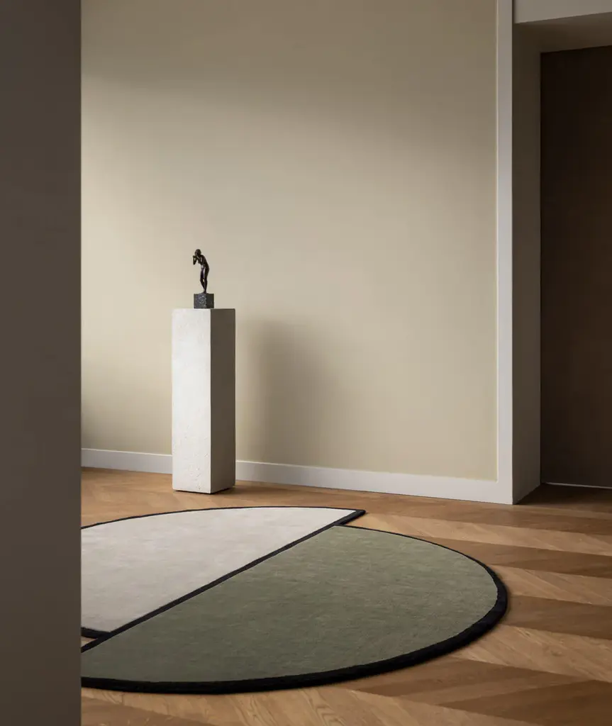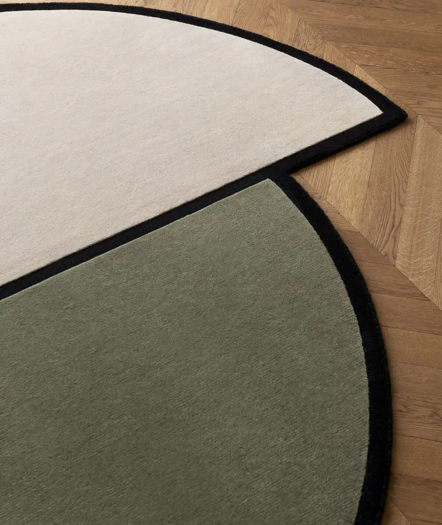 Designed by Swedish architect Andreas Martin Löf for his living and work space in Norr Mälarstrand, Stockholm. Inspired by the typical “Norr Mälarstrand” aesthetics where the architecture lies on the border of classicism and modernism. The rugs patterns are based on elements and colors from the building in green and oatmeal with black accents.
