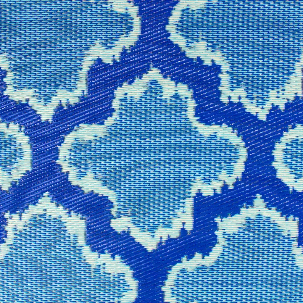 Our two-tone blue quatrefoil rug features a textured weave that's super comfortable underfoot. It is mold and mildew-resistant and built to withstand color fading from the sun. It has been designed to hold up exceptionally well in high-traffic areas, whether it is used indoor or outdoor. The flat weave design of this rug melds style with durability, making it the perfect accessory piece to any porch, poolside deck, backyard patio, or indoor space that needs an easy-to-care-for rug. Product features: Color(s): dark and light blue Shape: rectangular Machine made Outdoor safe Easy care Pile height: flat Backing: no Easy-to-clean, stain resistant, and does not shed May be used with a rug pad for extra comfort, protection, longevity and safety (not included) Dimensions: 4' wide x 6' long Material(s): polypropylene