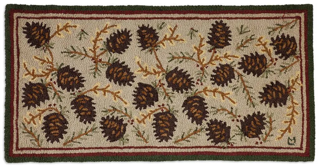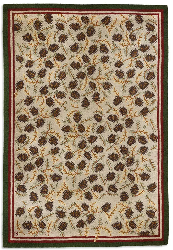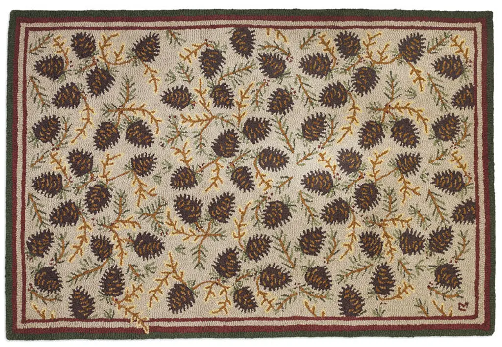Our Northwoods Cones Hand-Hooked Wool Rug brings the great outdoors to your home with the look of inviting pines.Designed by Vermont artists passionate about the American outdoors, our Northwoods Cones Hand-Hooked Wool Rug is perfect for protecting and decorating your floors or hearth. All-natural wool is hand-hooked into a thick, chunky loop that provides substantial protection and comfort for anywhere you place it, even in front of your fireplace.Hand-hooked of luxurious, 100% New Zealand wool with a cotton canvas backing, this charming rug features a motif of pine cones and boughs intertwined with rich colors for a rustic look you’ll love anywhere.Durable wool fibers are sustainable, easy care and non-allergenic. Imported.