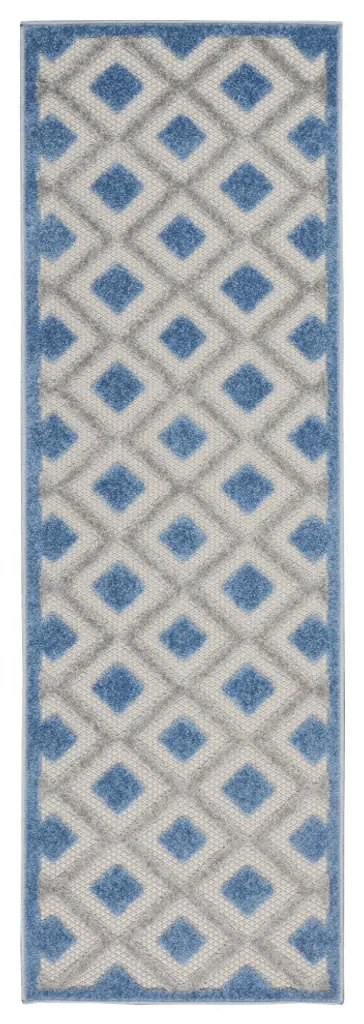 Introduce texture and pattern to your porch or deck with ease with this outdoor rug from the Aloha Collection. Simple in its sophistication, it features an all-over concentric diamond motif with a simple border in grey, blue, and ivory tones that work beautifully in modern and contemporary settings. Made from premium stain resistant fibers for durability and ease of cleaning. Hand washable outdoors: rinse with a hose and air dry.EYE-CATCHING PATTERN: This geometric outdoor rug is flatwoven with a subtly raised cut pile for a distinctive look and soft texture.VERSATILE DESIGN: The durable polypropylene construction makes this low pile rug ideal for both outdoor and high-traffic indoor areas.CLEANS EASILY: Whether you have cats, dogs, young kids, or all of the above, you�ll love this easy clean rug. Simply vacuum away loose dirt or hose-rinse & air dry any spills.LOW PROFILE: The short, 0.25-inch rug height is great for placement near your entryway or underneath furniture.PLEASE NOTE: We strongly recommend using a rug pad to keep your rug in place when using indoors.OEKO-TEX Certified