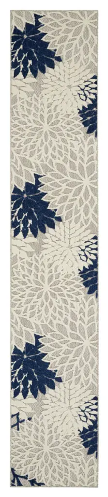 In shades of navy-blue, grey, and white, this Aloha outdoor rug brings extra life and excitement to your patio, deck, or poolside. Its high-low construction combines delightful texture with an intricately woven base for an exceptional look and feel that stands up to the elements. This rug is machine-made from premium stain-resistant fibers that are easily washable with a hose: simply rinse and allow both sides time to fully air dry. To extend the life of your rug, bring indoors during extreme weather.BOLD STYLE: The oversized blooms of this floral outdoor rug are enhanced with a high-low pile that adds an attention-grabbing pop of pattern to your decor.SOFT TEXTURE: The raised, cut pattern has a wonderfully soft texture that feels great on bare feet.EASY TO CLEAN: To keep your rug looking fresh, simply vacuum and spot clean spills when using indoors. This rug is also manually washable: just rinse with a hose and air dry.DURABLE CONSTRUCTION: Machine-made from polypropylene fibers designed to stand up to everyday life � ideal for busy households.To extend the life of your rug, we recommend bringing it indoors during extreme weather.OEKO-TEX Certified