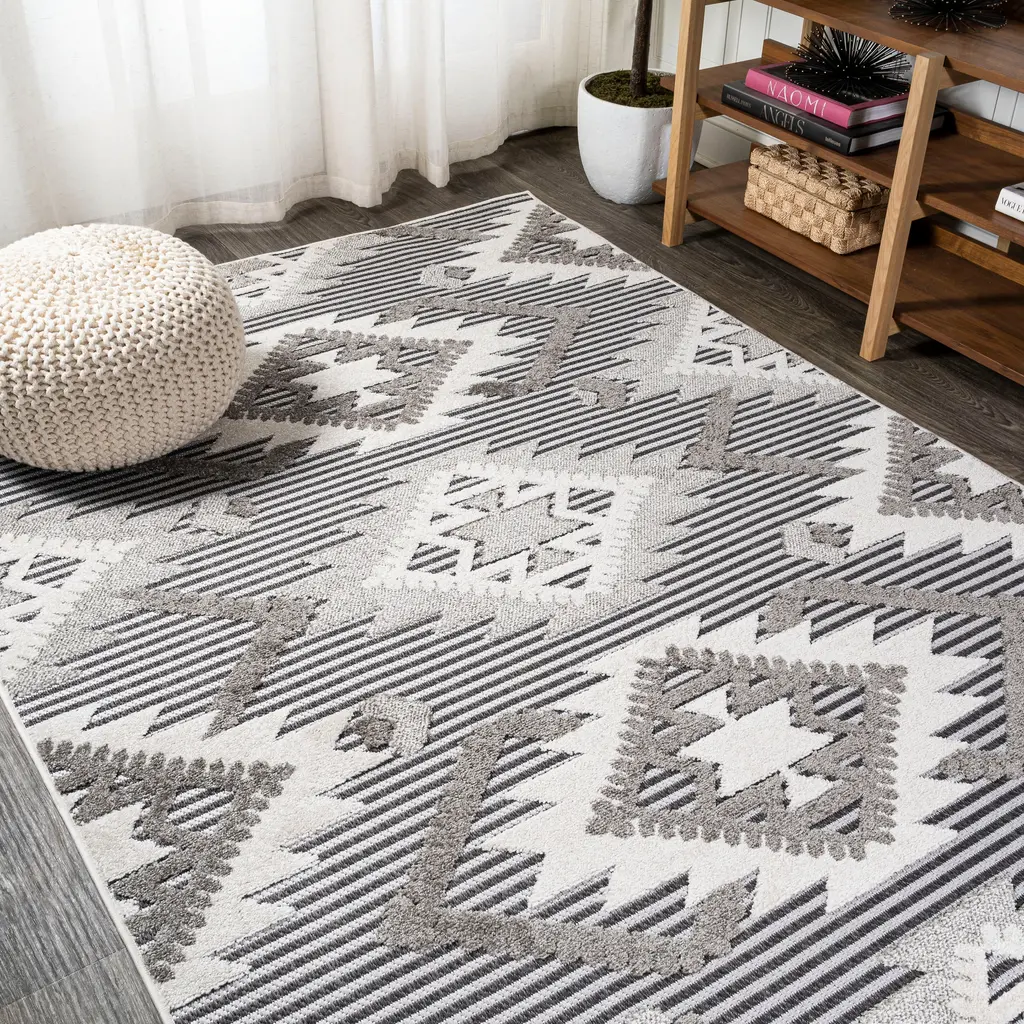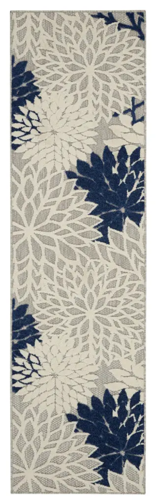 In shades of navy-blue, grey, and white, this Aloha outdoor rug brings extra life and excitement to your patio, deck, or poolside. Its high-low construction combines delightful texture with an intricately woven base for an exceptional look and feel that stands up to the elements. This rug is machine-made from premium stain-resistant fibers that are easily washable with a hose: simply rinse and allow both sides time to fully air dry. To extend the life of your rug, bring indoors during extreme weather.BOLD STYLE: The oversized blooms of this floral outdoor rug are enhanced with a high-low pile that adds an attention-grabbing pop of pattern to your decor.SOFT TEXTURE: The raised, cut pattern has a wonderfully soft texture that feels great on bare feet.EASY TO CLEAN: To keep your rug looking fresh, simply vacuum and spot clean spills when using indoors. This rug is also manually washable: just rinse with a hose and air dry.DURABLE CONSTRUCTION: Machine-made from polypropylene fibers designed to stand up to everyday life � ideal for busy households.To extend the life of your rug, we recommend bringing it indoors during extreme weather.OEKO-TEX Certified