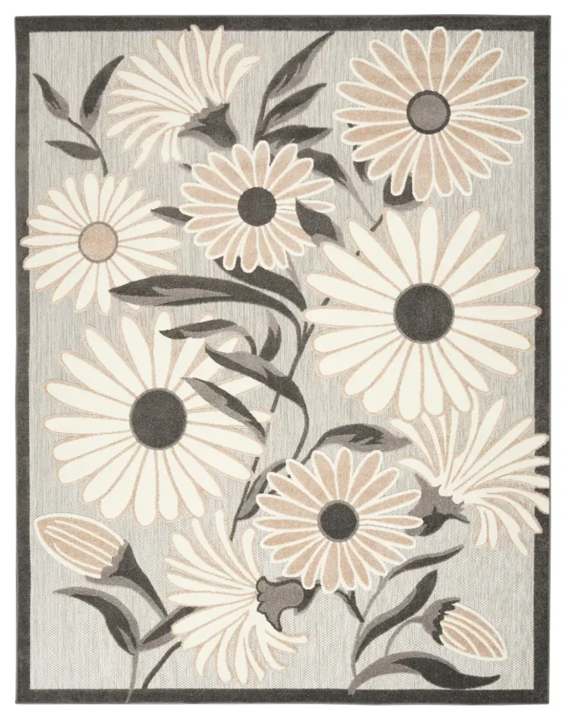 Bring a touch of nature to your floors with this beige floral outdoor rug from the Aloha Collection. The oversized daisy pattern truly pops thanks to a subtly raised finish that adds a surprisingly soft texture to the flatwoven surface. This contemporary rug is stylish and functional, pulling double duty as a foundation for both your indoor and outdoor spaces. Hand washable outdoors: rinse with a hose and air dry.EYE-CATCHING PATTERN: This floral outdoor rug is flatwoven with a subtly raised cut pile for a distinctive look and soft texture.VERSATILE DESIGN: The durable polypropylene construction makes this low pile rug ideal for both outdoor and high-traffic indoor areas.CLEANS EASILY: Whether you have cats, dogs, young kids, or all of the above, you�ll love this easy clean rug. Simply vacuum away loose dirt or hose-rinse & air dry any spills.LOW PROFILE: The short, 0.25-inch rug height is great for placement near your entryway or underneath furniture.PLEASE NOTE: We strongly recommend using a rug pad to keep your rug in place when using indoors.OEKO-TEX Certified