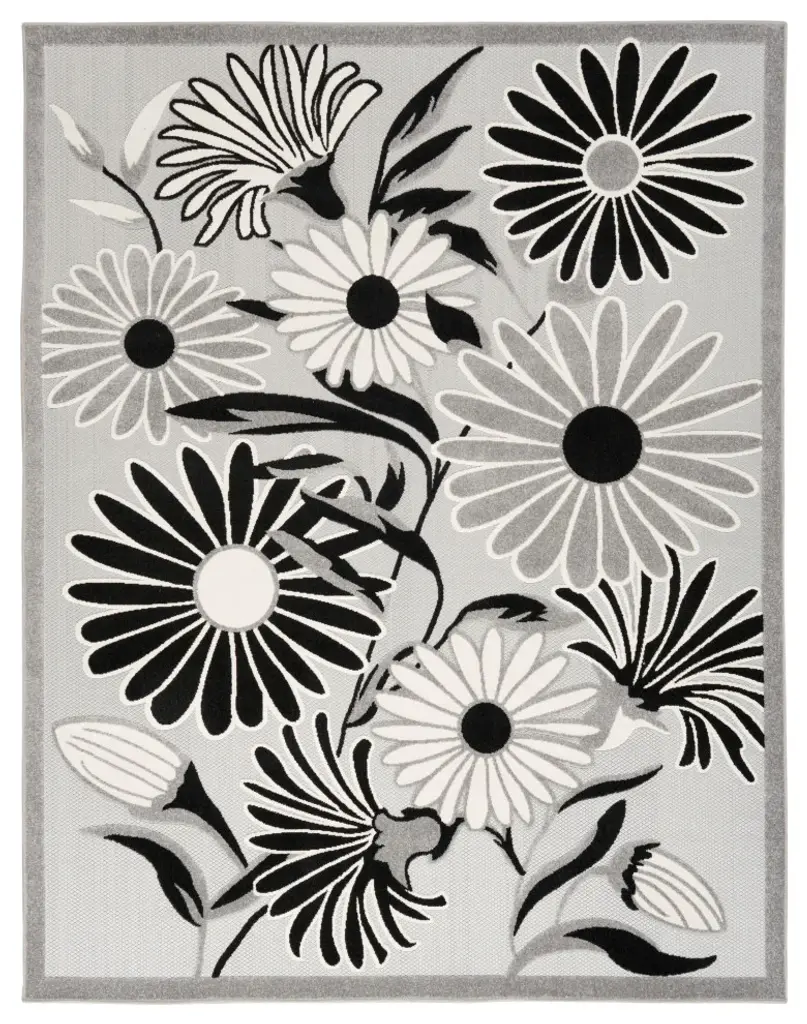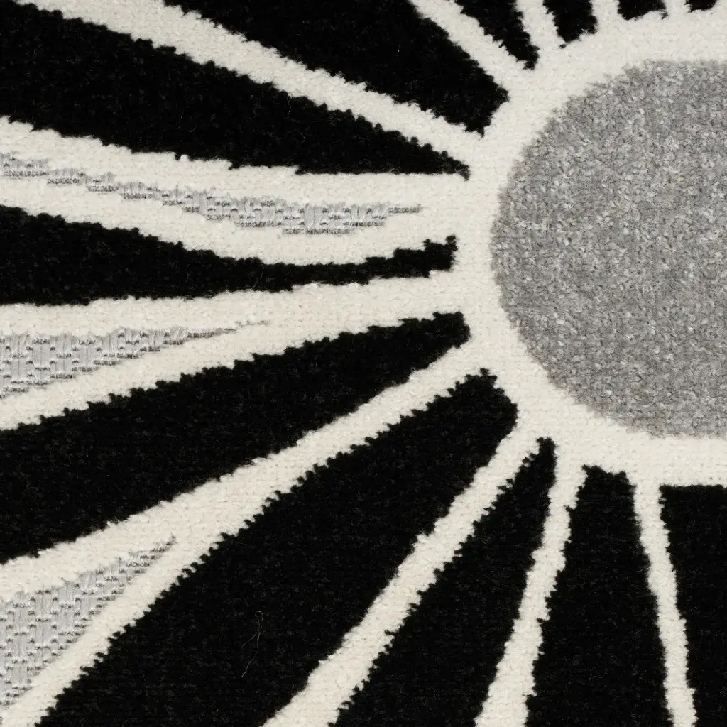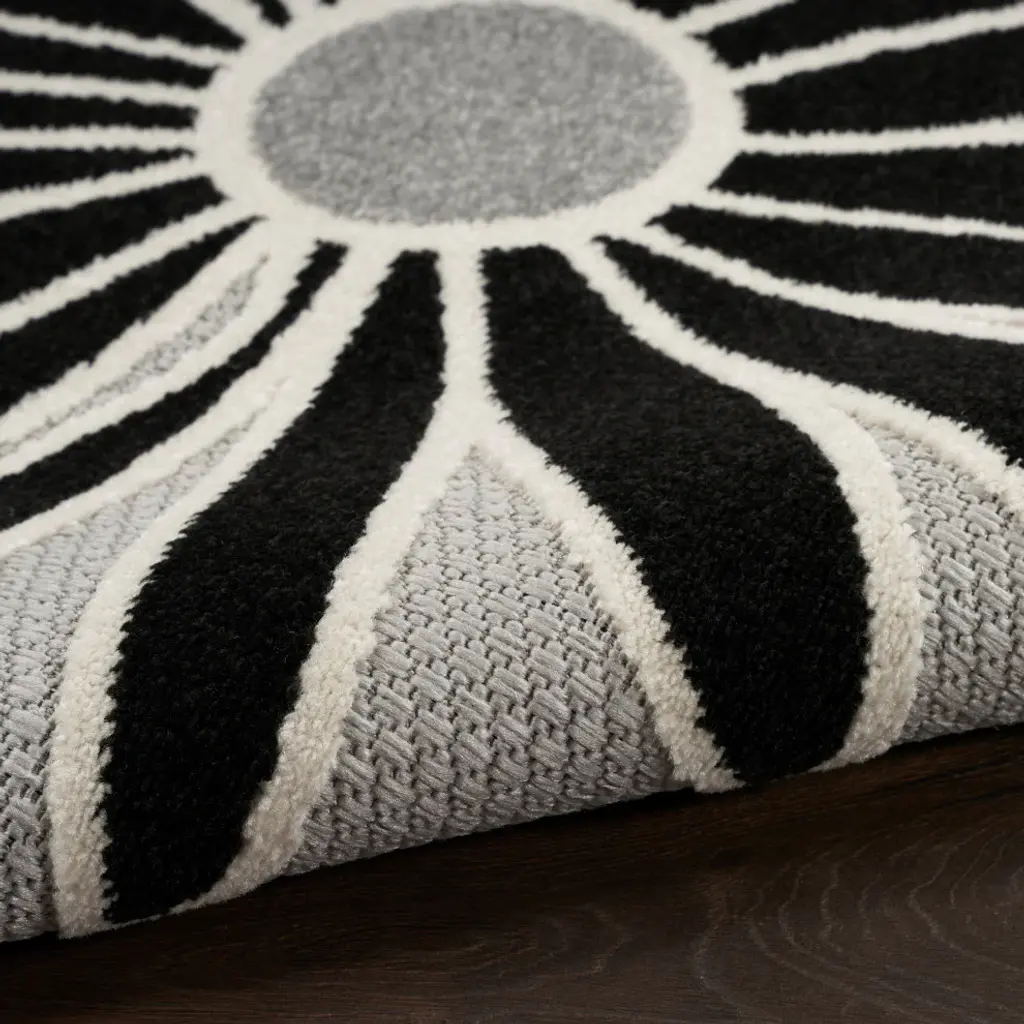Bring a touch of nature to your floors with this black and white floral outdoor rug from the Aloha Collection. The oversized daisy pattern truly pops thanks to a subtly raised finish that adds a surprisingly soft texture to the flatwoven surface. This contemporary rug is stylish and functional, pulling double duty as a foundation for both your indoor and outdoor spaces. Hand washable outdoors: rinse with a hose and air dry.EYE-CATCHING PATTERN: This floral outdoor rug is flatwoven with a subtly raised cut pile for a distinctive look and soft texture.VERSATILE DESIGN: The durable polypropylene construction makes this low pile rug ideal for both outdoor and high-traffic indoor areas.CLEANS EASILY: Whether you have cats, dogs, young kids, or all of the above, you�ll love this easy clean rug. Simply vacuum away loose dirt or hose-rinse & air dry any spills.LOW PROFILE: The short, 0.25-inch rug height is great for placement near your entryway or underneath furniture.PLEASE NOTE: We strongly recommend using a rug pad to keep your rug in place when using indoors.OEKO-TEX Certified