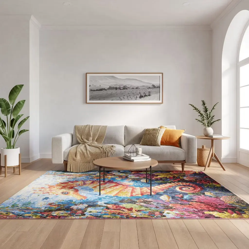 Bursting with color, this coastal indoor-outdoor rug from the Color Splash collection creates a bold focal point for patios, sunrooms, and poolside decks. The mosaic-style seahorse, surrounded by lush coral reefs, is woven in vivid multicolored hues that feels alive with movement and detail. Made from a blend of polypropylene and polyester in a flatweave construction for easy care. Fuss-free care: simply rinse with a hose and air dry.