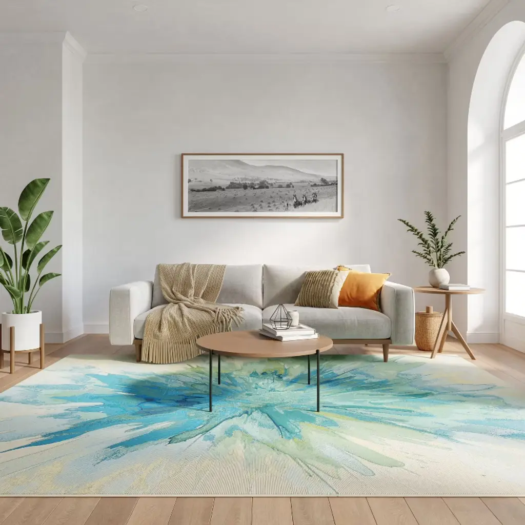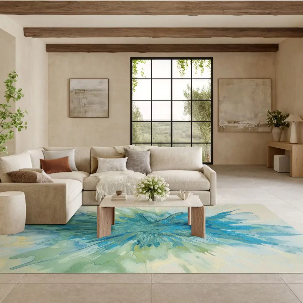 Add a splash of color to your patio, porch, or deck with this abstract indoor-outdoor rug from the Color Splash collection. Soft blue and green tones radiate outwards, creating an energizing effect perfect for gatherings with friends and family. This flatweave rug is made from a blend of polypropylene and polyester for easy care. Fuss-free care: simply rinse with a hose and air dry.