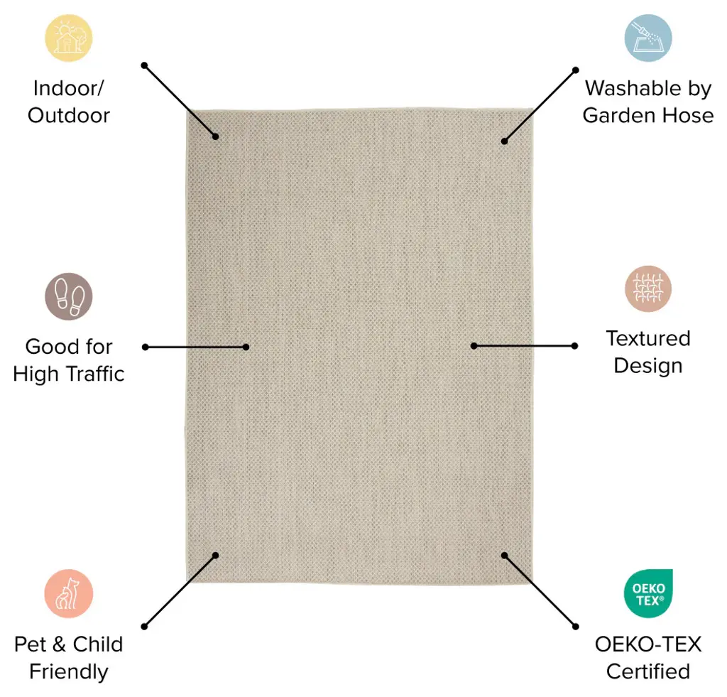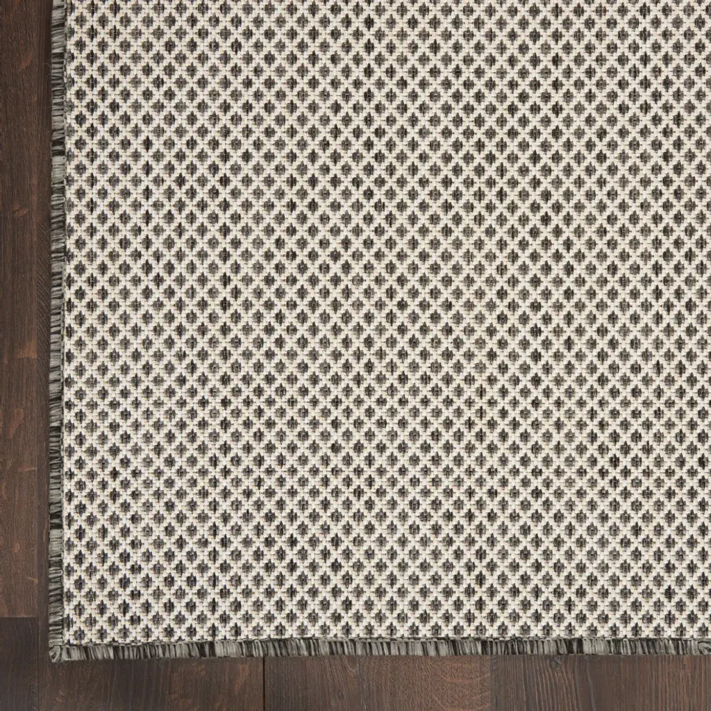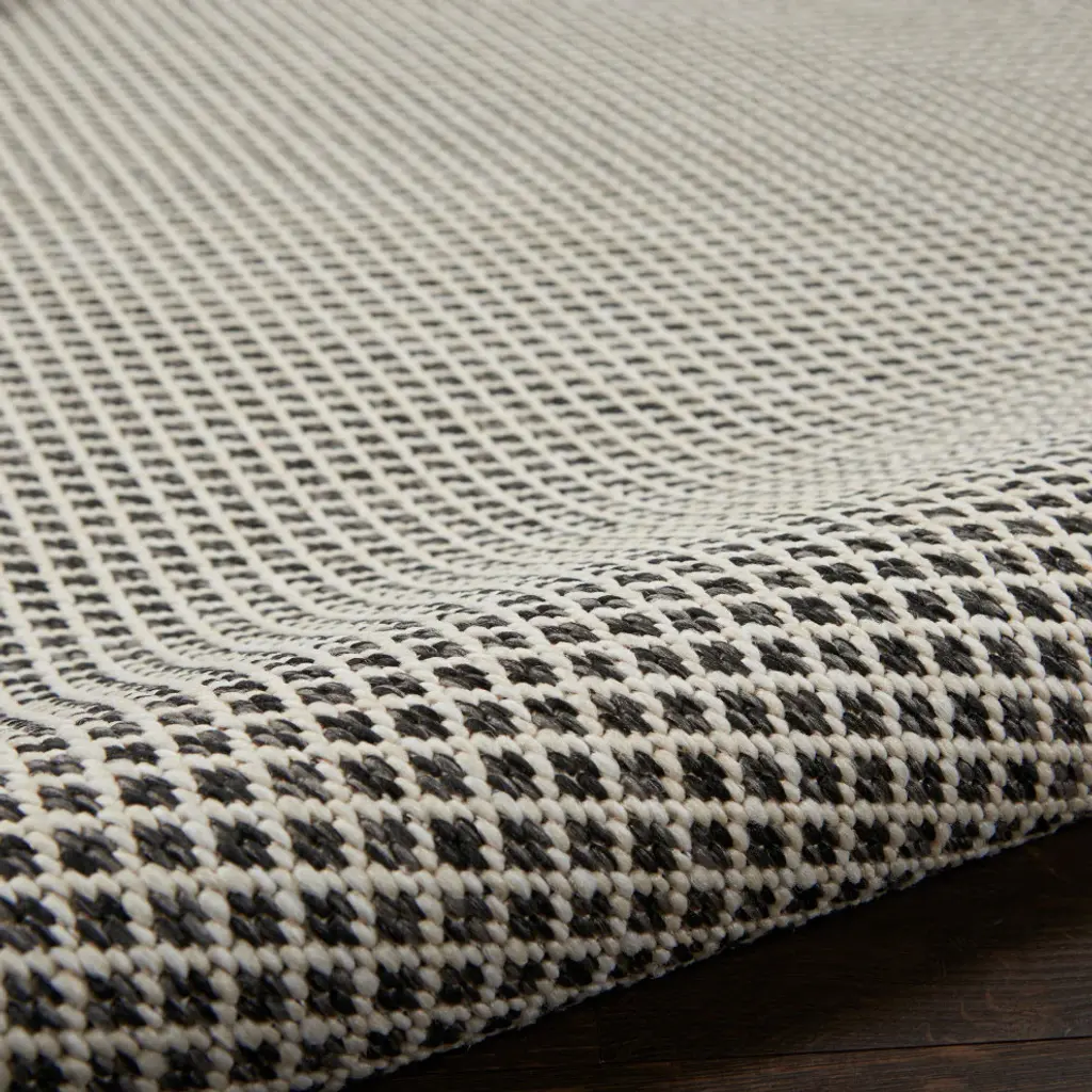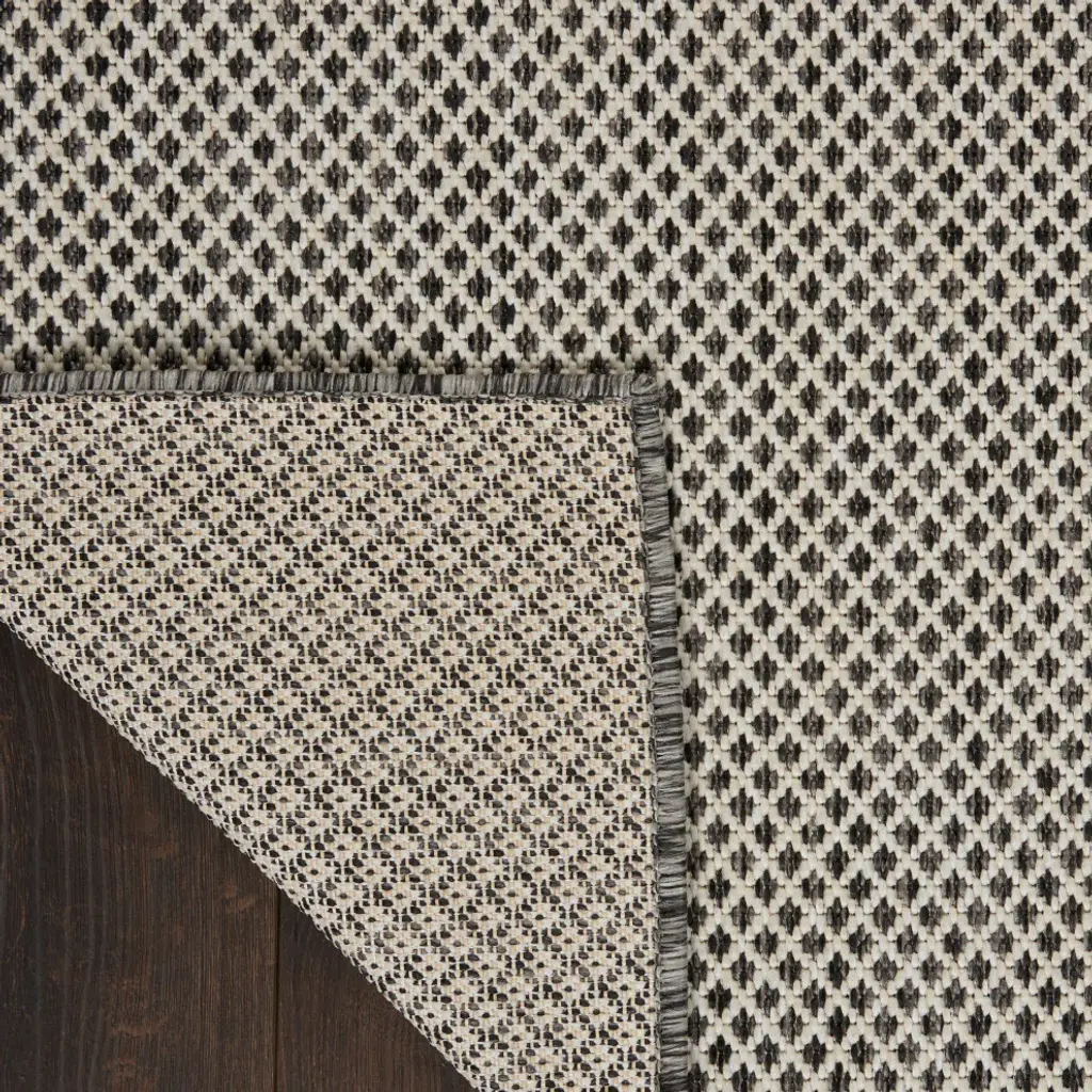 With its striking geometric pattern, this Courtyard Collection outdoor rug exudes contemporary style. Its subtly textured surface is crafted in classic ivory and charcoal grey for a seamless complement to modern settings. Machine made from a blend of polypropylene and polyester in a flatweave style that stands up to heavy traffic. Easily washable outdoors: just hose-rinse and air dry.MODERN STYLE: This outdoor rug features a classic geometric lattice pattern that adds a refreshing, contemporary look to your decor.VISUALLY APPEALING: The subtly woven surface adds an intriguing pop of texture, enhanced by space-dyed colors for added movement and depth.INDOOR/OUTDOOR: This versatile flatweave rug is designed to stand up to regular traffic, making it an ideal foundation for both indoor and outdoor furnishings.LOW-MAINTENANCE: Easily washable with a hose � simply rinse and allow both sides to fully dry.We recommend a rug pad when using indoors.OEKO-TEX Certified