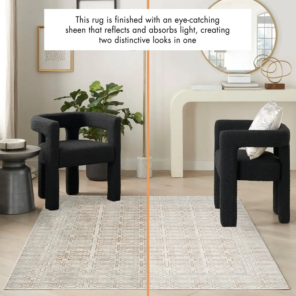 The Desire Collection of geometric and abstract rugs tastefully blends classic design elements with a modern sensibility. Pattern and texture variations, presented in neutral color palettes, are enhanced with a brilliant sheen that reflects or absorbs light to create two distinctive looks in one. These modern rug designs are made from easy-clean, non-shedding polyester yarns that feel amazingly soft underfoot, with a low pile height that fits easily under furniture. Features: