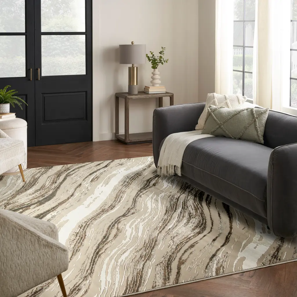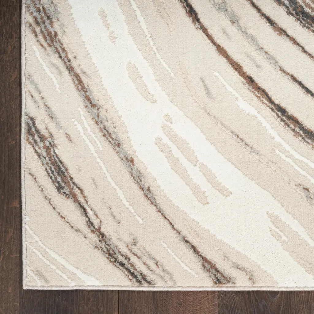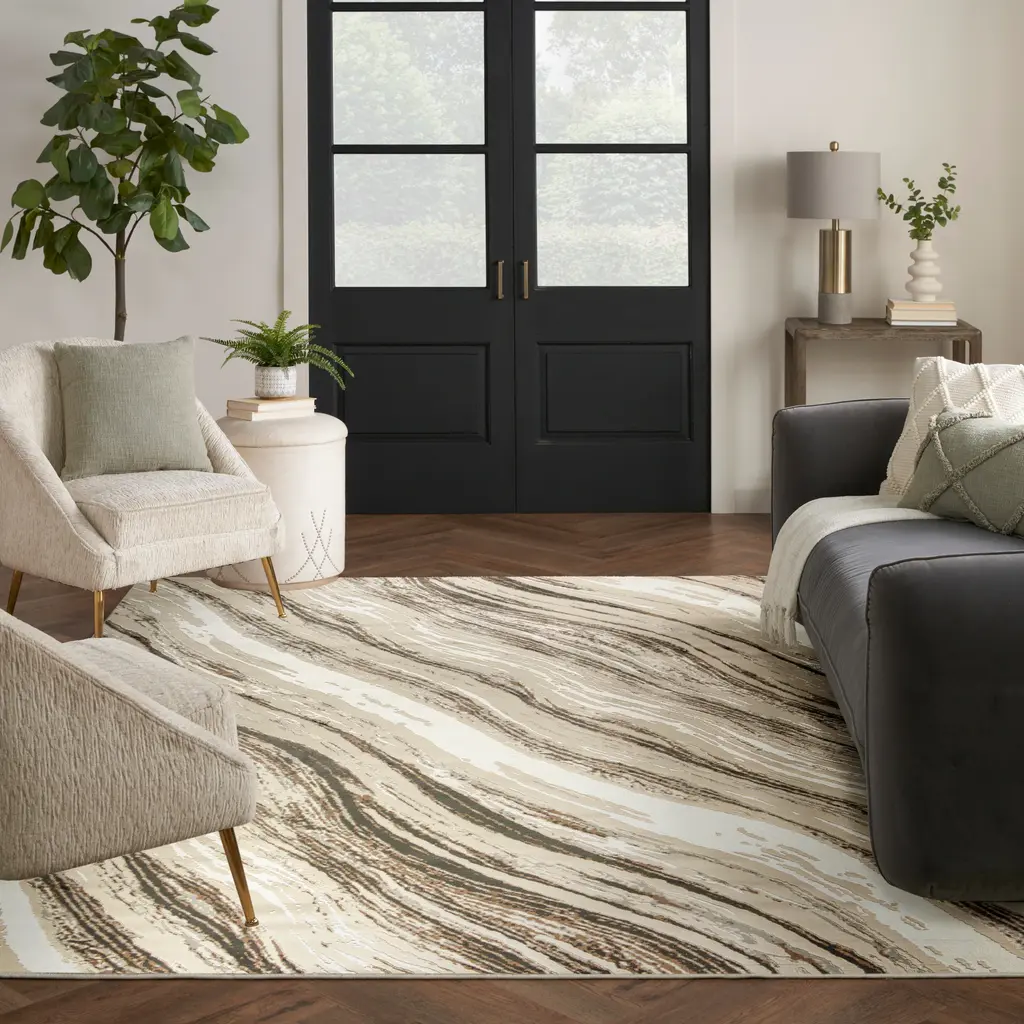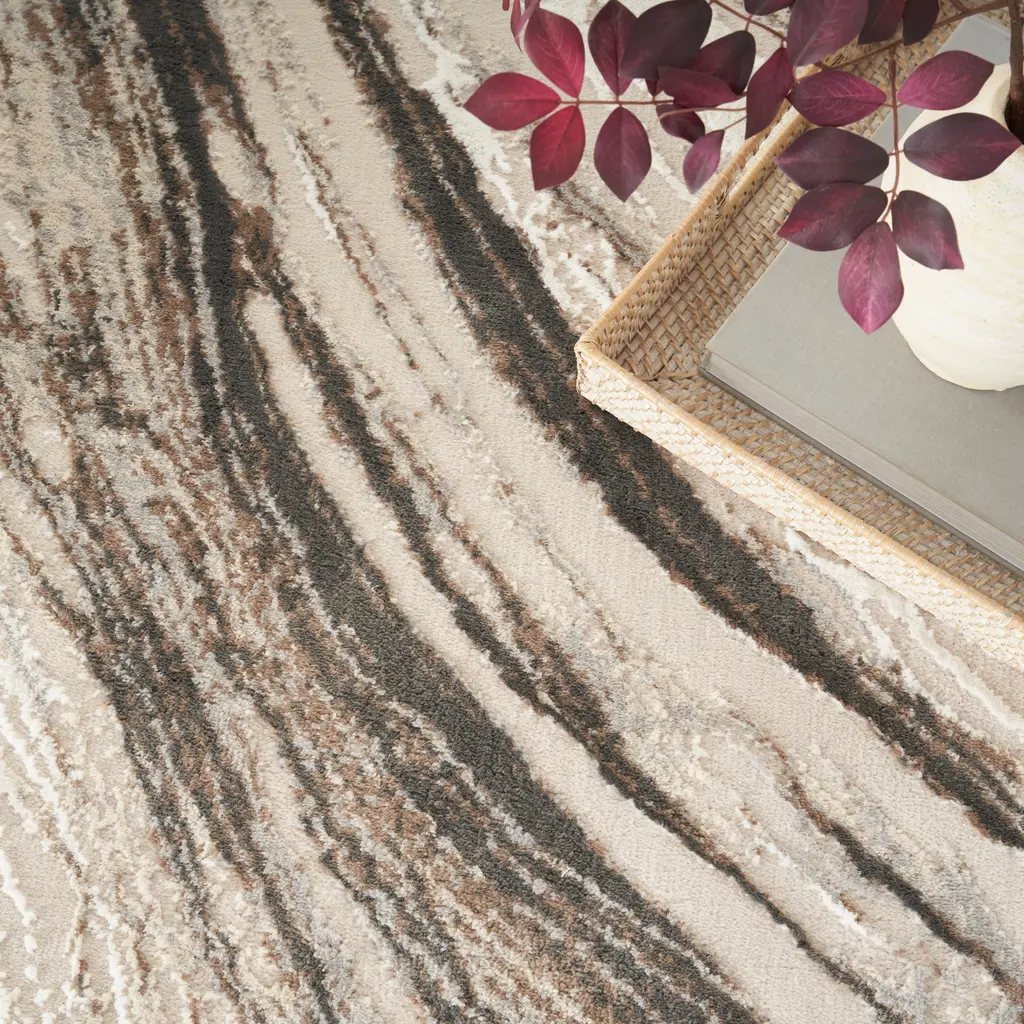Create a state of flow with this abstract rug from the Eco-Friendly Collection. The wavy grey, ivory, and brown pattern adds visual appeal to your living room, bedroom, hallway, or kitchen décor. Woven from recycled polyester yarns, this softly textured rug is ultra-durable for fuss-free cleaning and lasting style.
