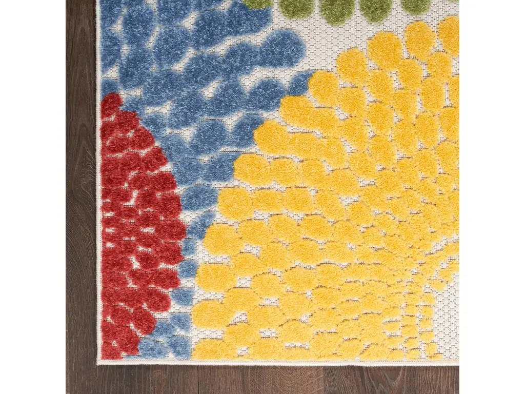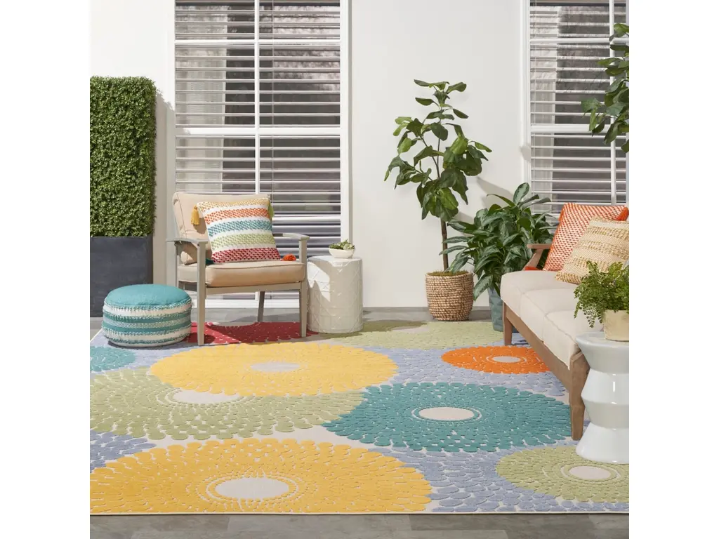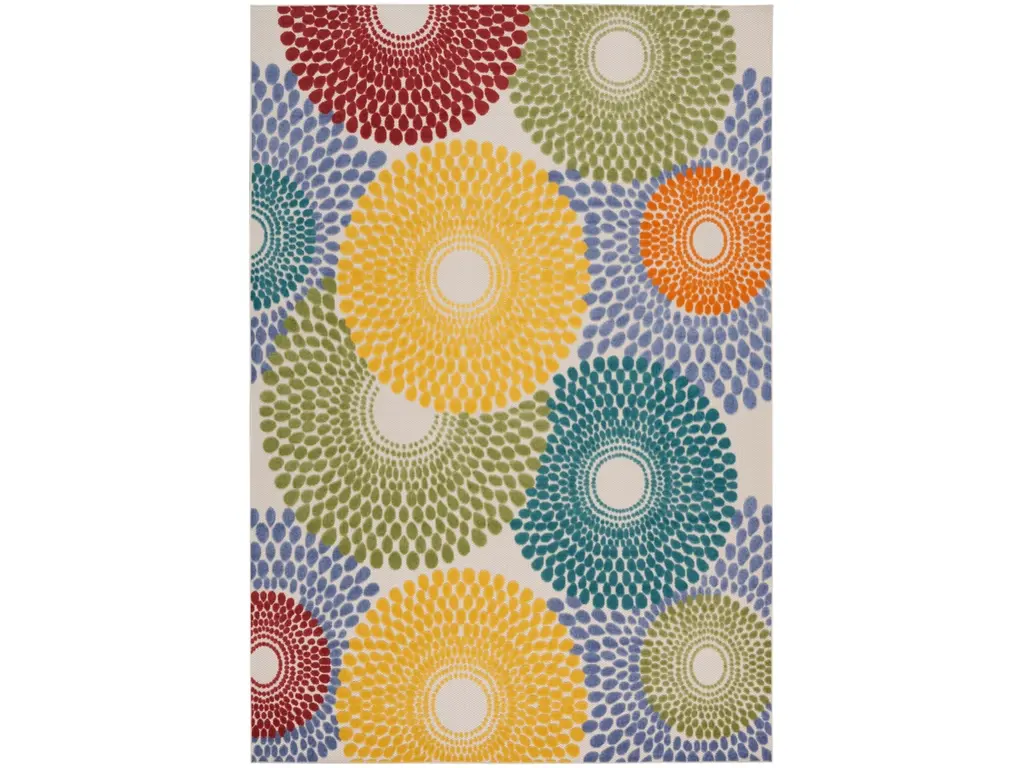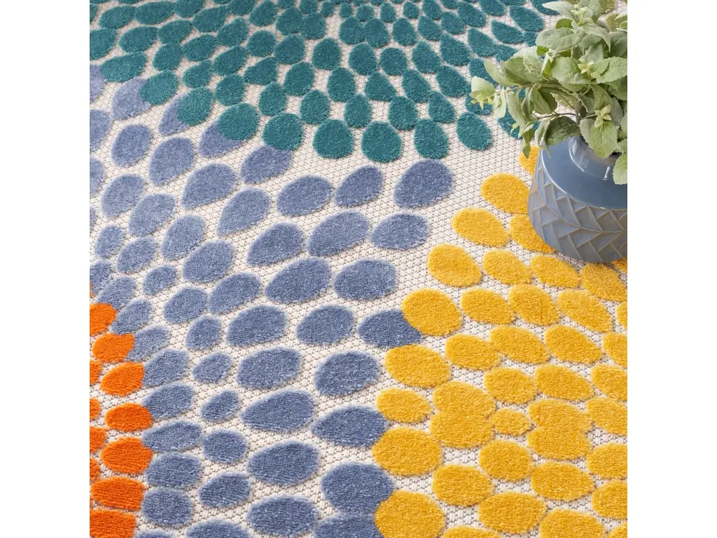 Liven up your space with the bold geometric design of this outdoor rug from the Aloha collection. Presented in vibrant blue, red, yellow, green, and orange, the overlapping circular tear drop pattern is enhanced by a soft, raised texture that stands out against its flatwoven ground. With a versatile, easy to clean construction, this neutral rug beautifully complements your indoor and outdoor spaces including the living room, dining room, hallway, deck, and patio. Hand washable outdoors: rinse with a hose and air dry.
