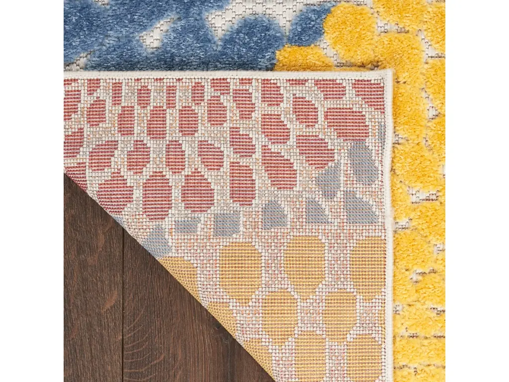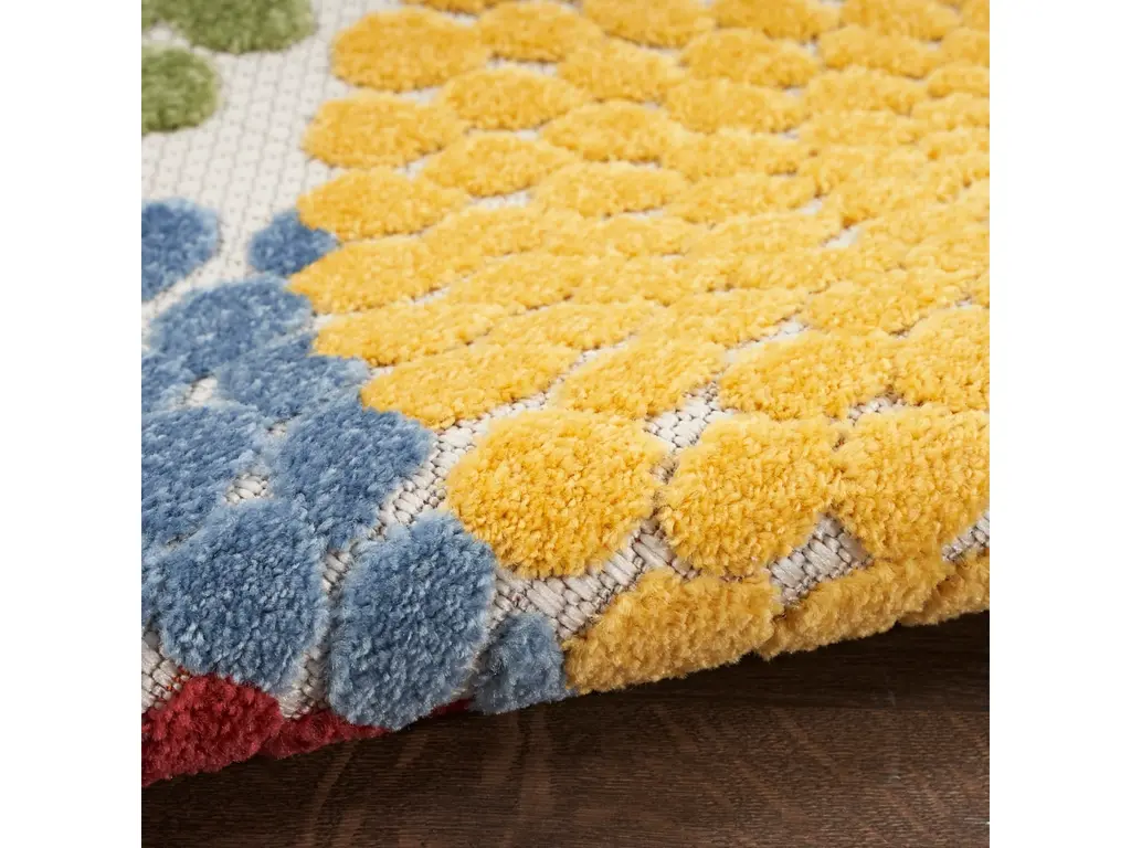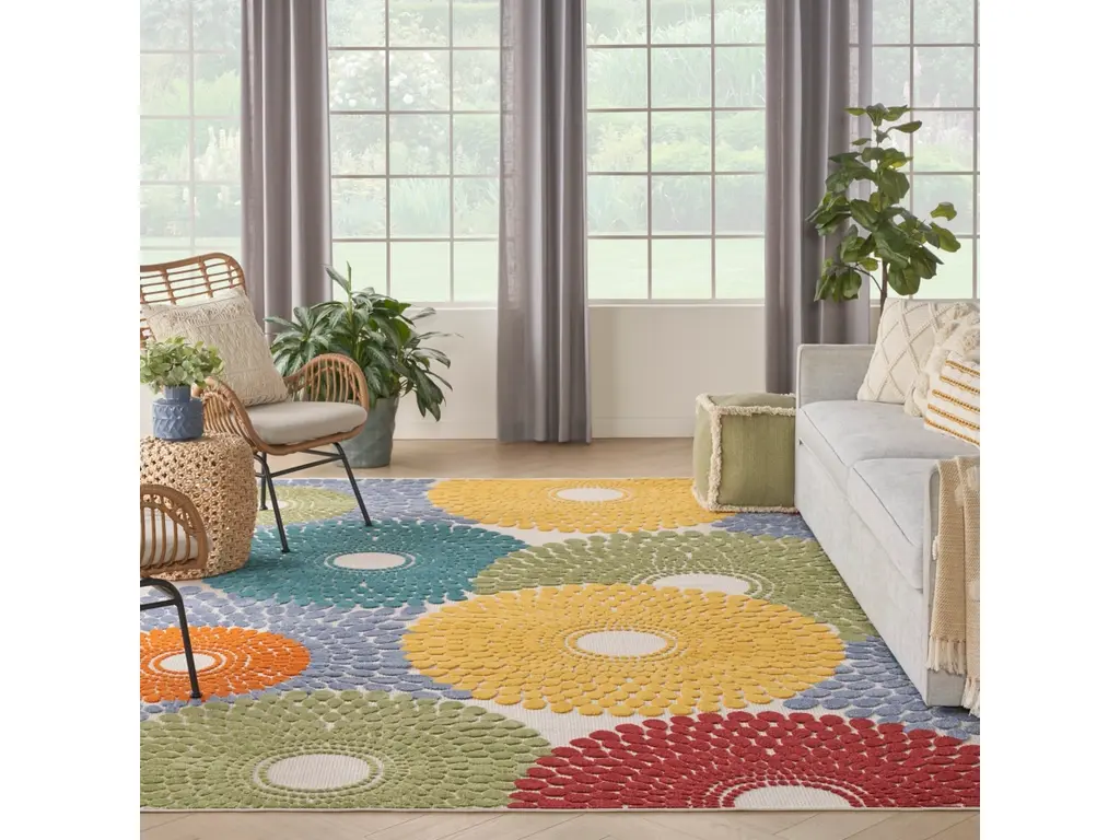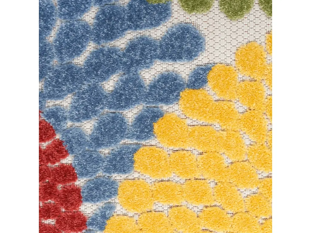 Liven up your space with the bold geometric design of this outdoor rug from the Aloha collection. Presented in vibrant blue, red, yellow, green, and orange, the overlapping circular tear drop pattern is enhanced by a soft, raised texture that stands out against its flatwoven ground. With a versatile, easy to clean construction, this neutral rug beautifully complements your indoor and outdoor spaces including the living room, dining room, hallway, deck, and patio. Hand washable outdoors: rinse with a hose and air dry.