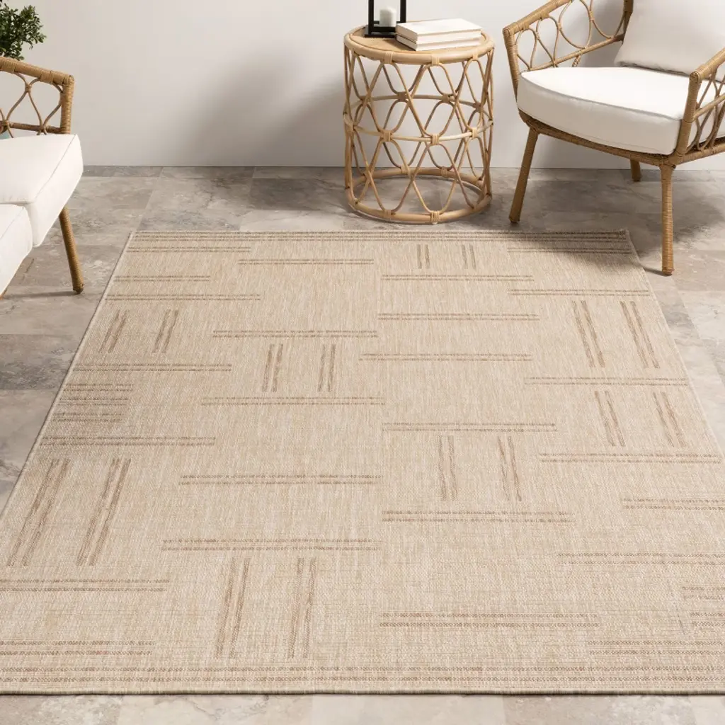 Crafted for versatility, this transitional indoor/outdoor area rug features a timeless geometric pattern and a 100% Polypropylene construction, ensuring both style and durability. Its machine-made design offers comfort and reliability, making it suitable for various living spaces including the bedroom, living room, dining room, hallway, kitchen, and patio/outdoor area. With a non-slip backing and stain-resistant properties, this rug provides peace of mind for households with children and pets, promising long-lasting beauty and functionality.