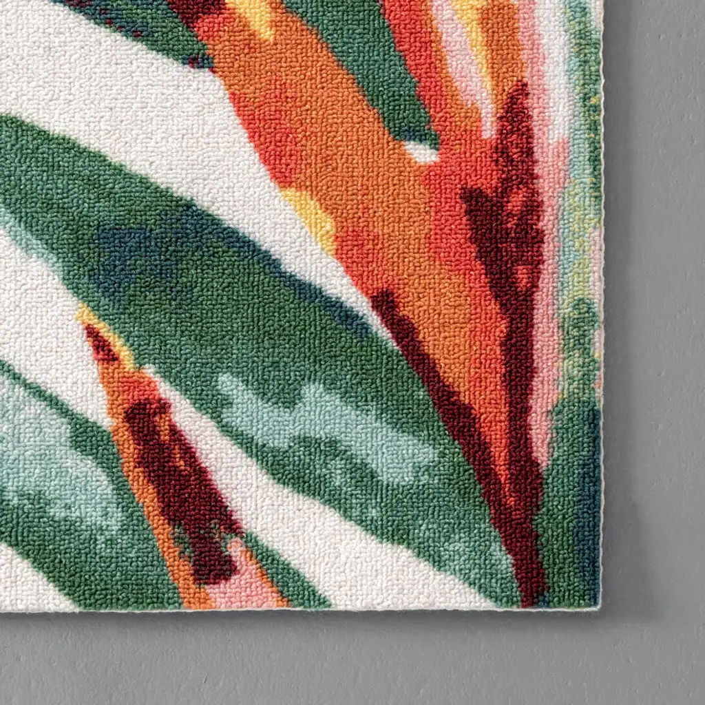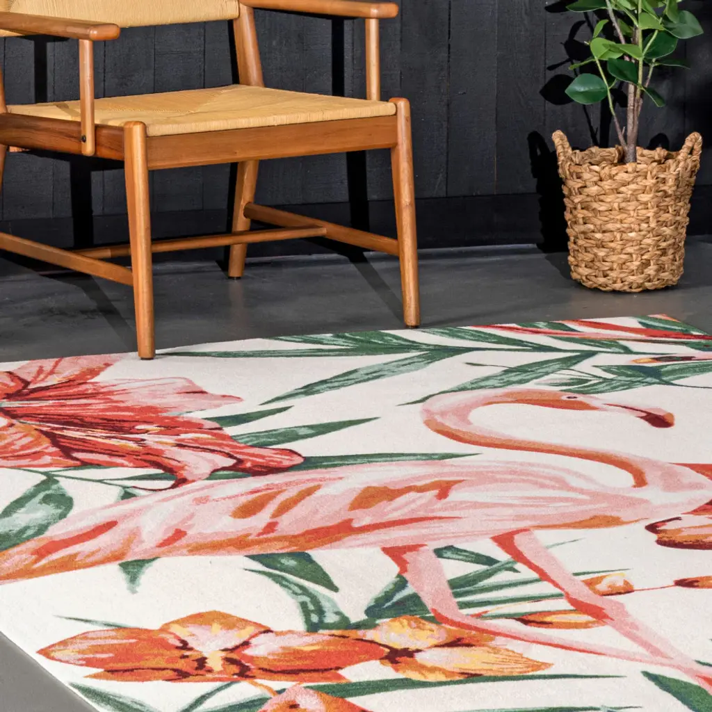 Get ready to turn heads with this floral flamingo indoor/outdoor area rug. Designed to stand up to the elements while adding a touch of charm to your surroundings whether you place this in your living room or on your patio. This floor covering pairs perfectly with any existing coastal or contemporary decor. Liven up your space with our easy to care for and pet-friendly area rugs.100% Polyester, made in ChinaDesigned with resilience against everyday wear-and-tear, this rug is kid and pet friendly and perfect for high traffic areas both indoors and outdoors such as patio, living room, kitchen, and hallwaysSleek and functional .16" pile height allows for convenient placement in entryways, underneath furniture, and will not obstruct doorwaysEasy to clean, we recommend hosing off dirt or debris and spot treating any mild stains with carpet cleaner