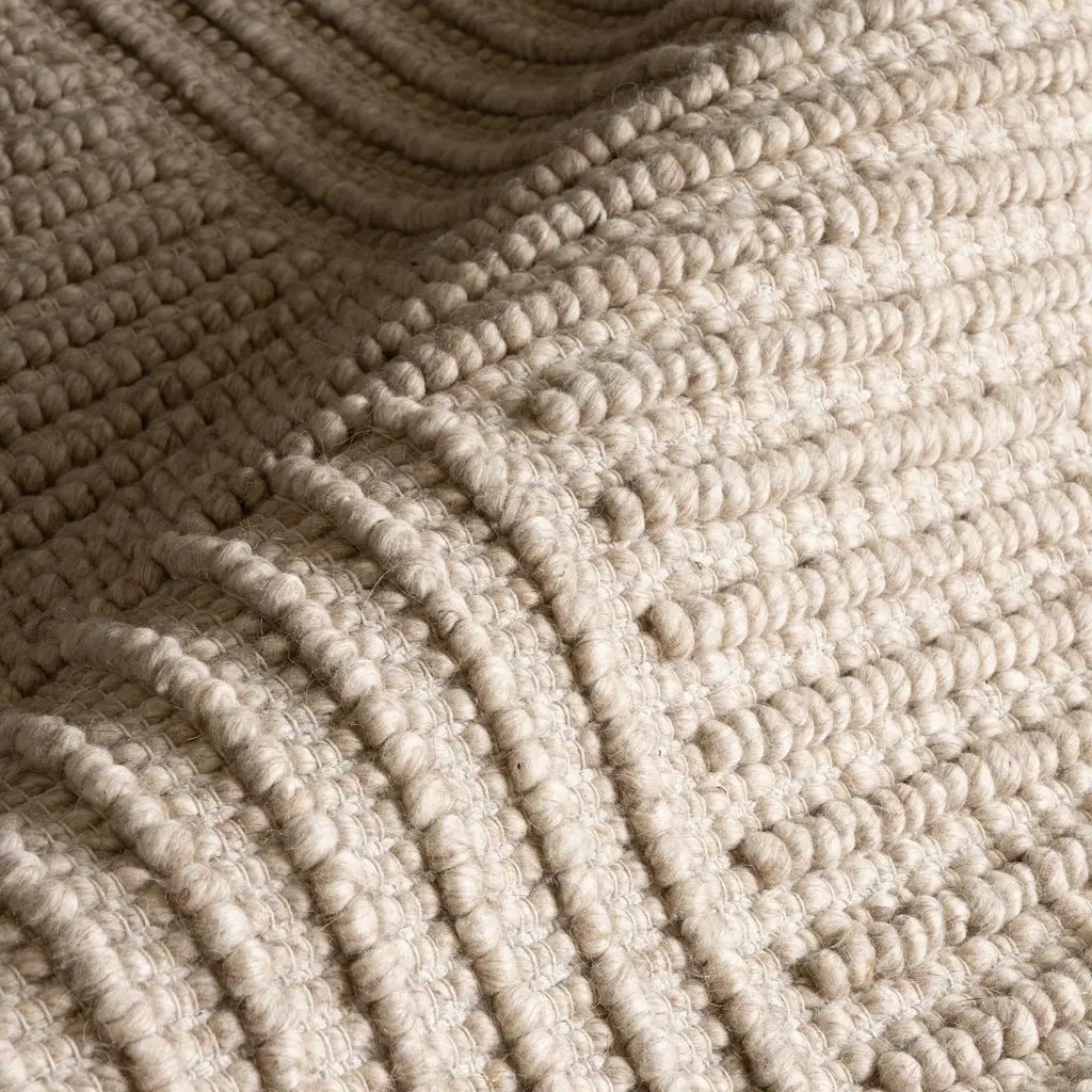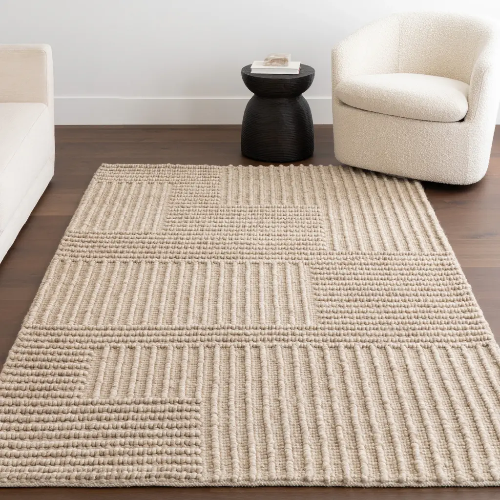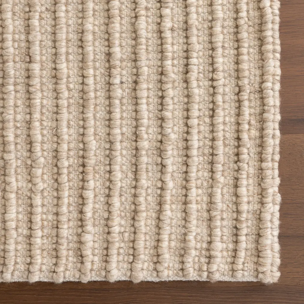 Create a bold space with this contemporary area rug. Made from wool and cotton fibers, this floor covering will surely make a statement in any room it's placed in. The handmade textured rug features a beautifully detailed high-low striped pattern and blends seamlessly with any décor from modern to bohemian. Never settle for anything less than perfection with our pet-friendly and easy to care for area rugs. 90% Wool, 10% Cotton, made in IndiaAdd warmth to your living room, bedroom, dining room, kitchen, or entryway with just the right amount of style and comfort with this wool blend rugSleek and functional hand tufted 0.25" thickness allows for convenient placement in entryways, underneath furniture, and will not obstruct doorwaysShedding is common in wool rugs, in addition to regular surface vacuuming (without beater bar), clean the floor under the rug. Spill or stains can be cleaned by gently blotting with a clean white clothWe recommend using a rug pad to provide extra cushioning and to prevent any possible slipping and sliding on your flooring. Rug pads serve as protective layering piece for your floor and your rug from any wear and tear, extending the life of your rug.