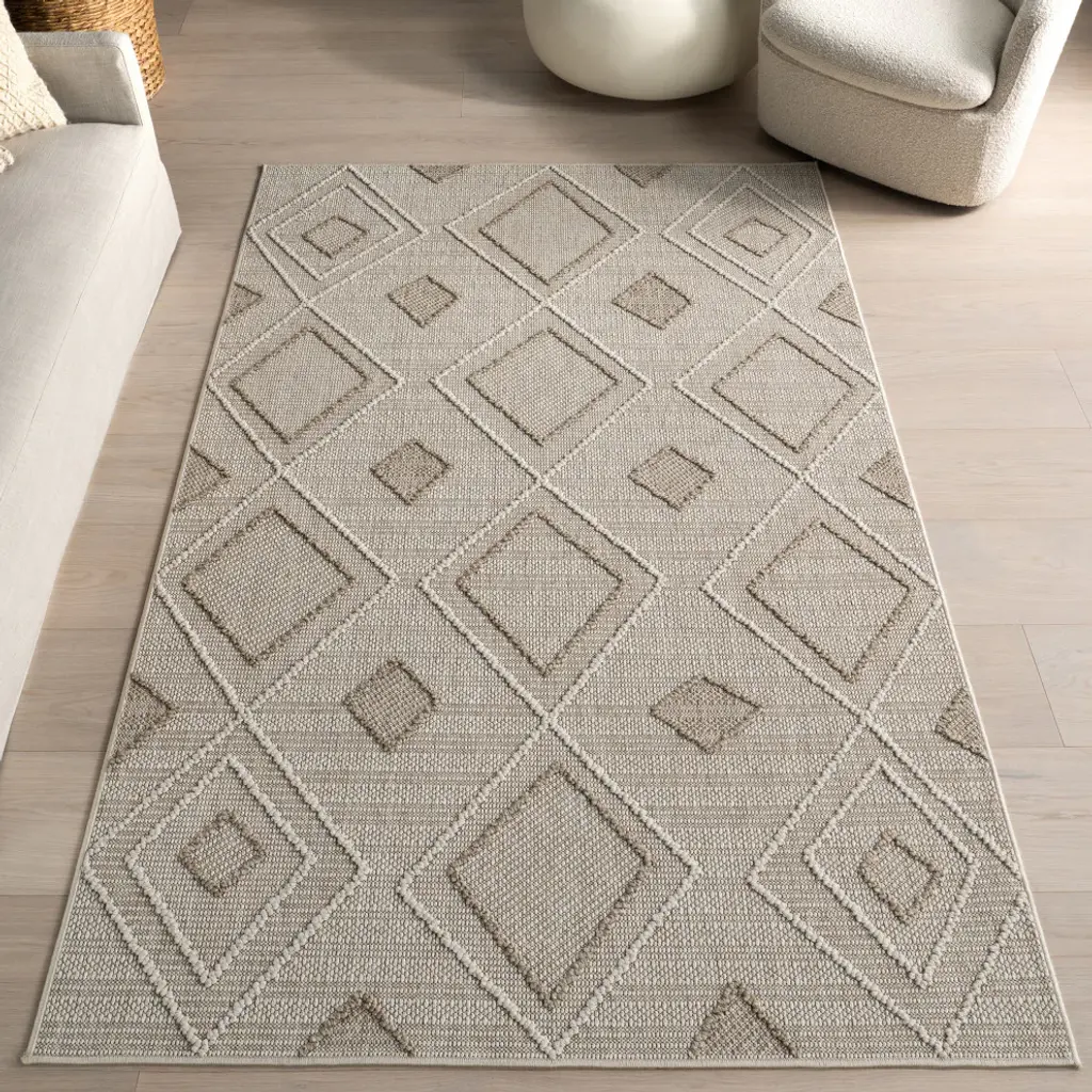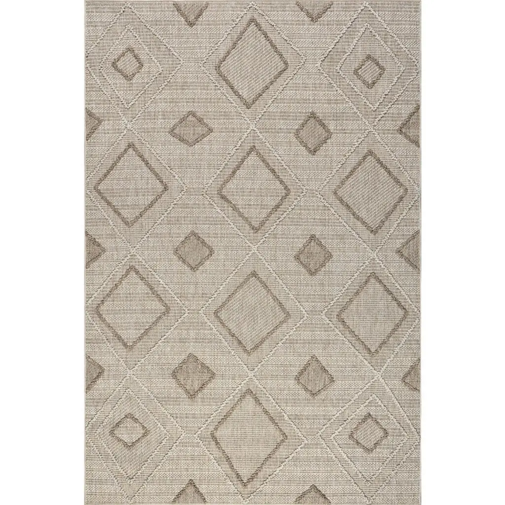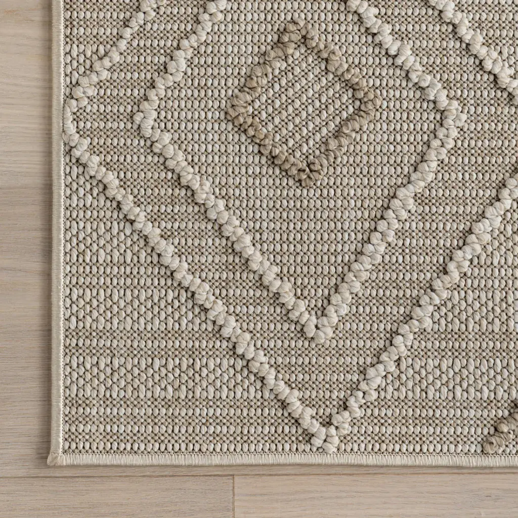 Elevate your home decor with the Nuloom Maline Geometric Indoor/Outdoor Area Rug, blending seamlessly with its transitional style and sophisticated geometric pattern. Crafted from 100% polypropylene, this rug is designed to endure high-traffic areas and outdoor elements while remaining pet-friendly and resistant to stains. Its versatile appeal allows it to complement various spaces, from bedrooms and dining rooms to living rooms, patios, and kitchens. Enjoy the ease of maintenance and durability, making it an ideal choice for both indoor elegance and outdoor comfort. Add a touch of contemporary flair and practicality to any room with this stylish and resilient rug.100% Polypropylene, made in TurkeyA rug that can withstand heavy use, is pet-friendly, and resists stains effectively, it''s perfect for enhancing any room including the bedroom, dining room, living room, patio, or kitchen.This rug boasts a pile height of 0.45 inches, striking the perfect balance between comfort and functionality.Clean spills immediately by blotting with a clean sponge or cloth. Vacuum without beater bar at lowest setting. Professional cleaning recommended.We recommend using a rug pad to provide extra cushioning and to prevent any possible slipping and sliding on your flooring. Rug pads serve as a protective layering piece for your floor and your rug preventing any wear and tear, extending the life of your rug.