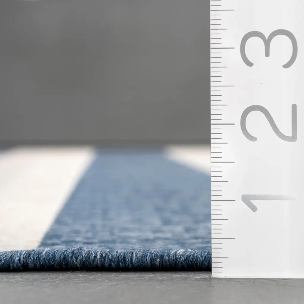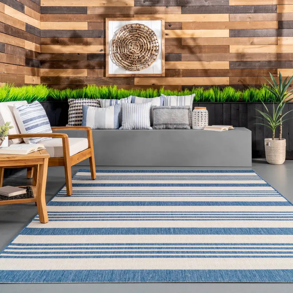 This striped area rug will be the finishing touch you''ve been looking! This floor covering can elevate your dining room or create a comforting environment on your patio. Made from durable synthetic fibers, this rug is built to last for years to come. Pair with nautical decor for a coastal feel, or farmhouse pieces for a rustic vibe. Kick back and relax with our pet-friendly and easy to care for area rugs.100% Polypropylene, made in BelgiumDesigned with resilience against everyday wear-and-tear, this rug is kid and pet friendly and perfect for high traffic areas both indoors and outdoors such as patio, living room, kitchen, and hallwaysSleek and functional .04" pile height allows for convenient placement in entryways, underneath furniture, and will not obstruct doorwaysWater resistant and easy to clean, this rug can be hosed down outside and spot treated for any mild stains using rug cleanerWe recommend using a rug pad to provide extra cushioning and to prevent any possible slipping and sliding on your flooring. Rug pads serve as protective layering piece for your floor and your rug from any wear and tear, extending the life of your rug