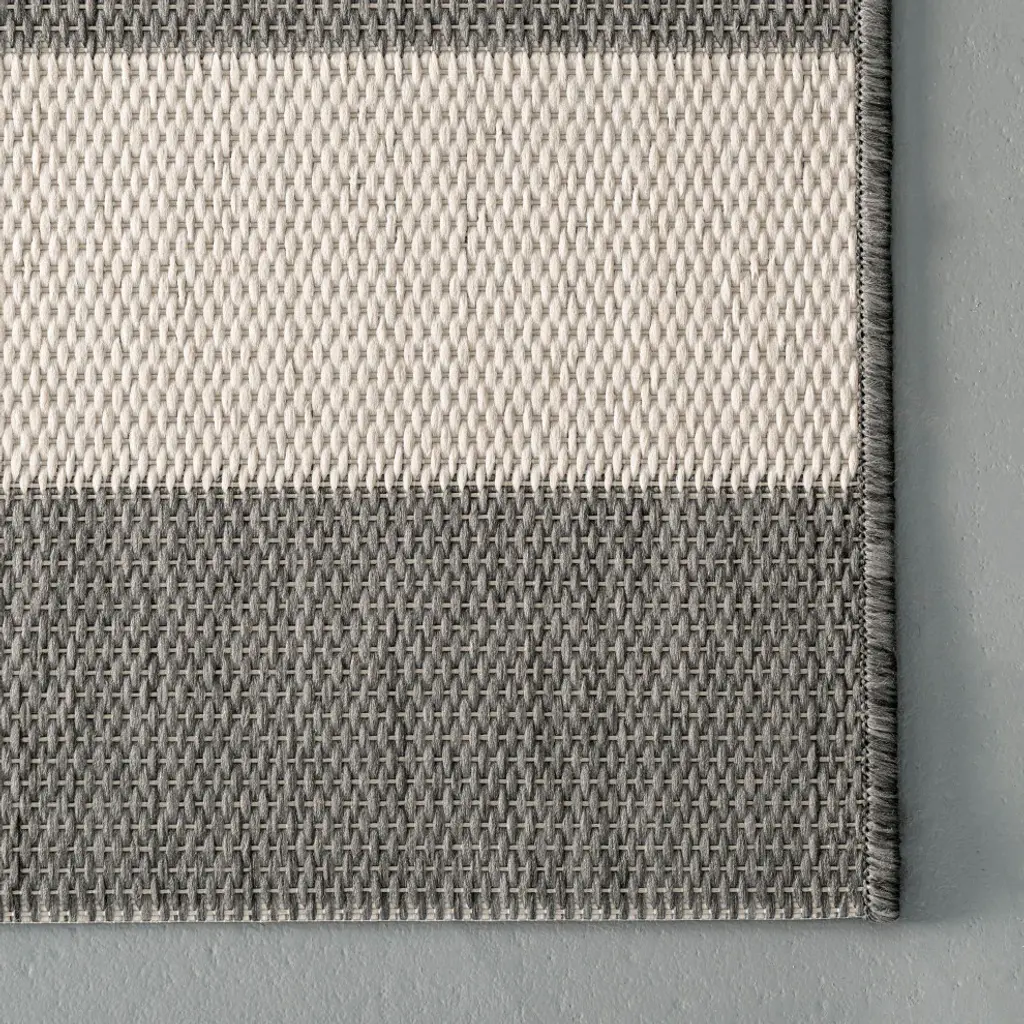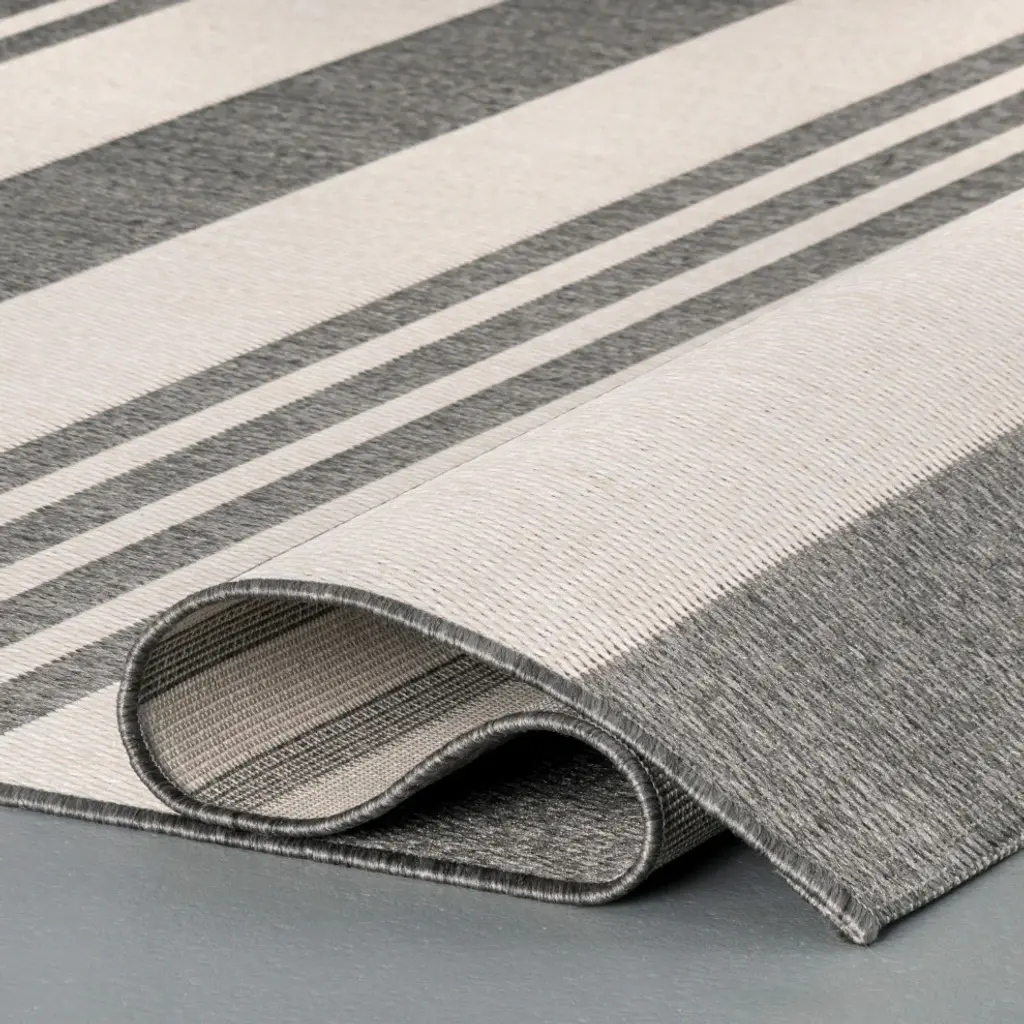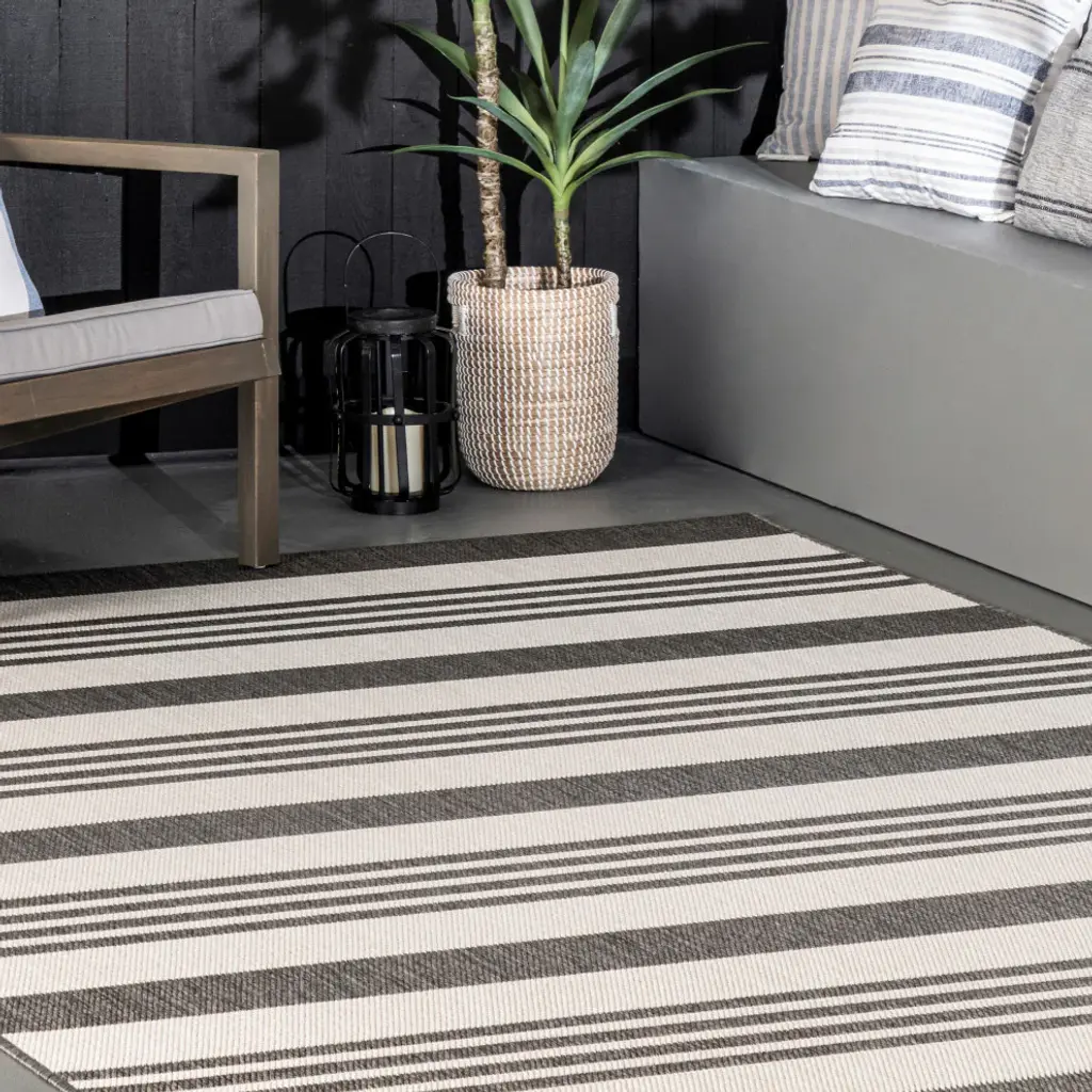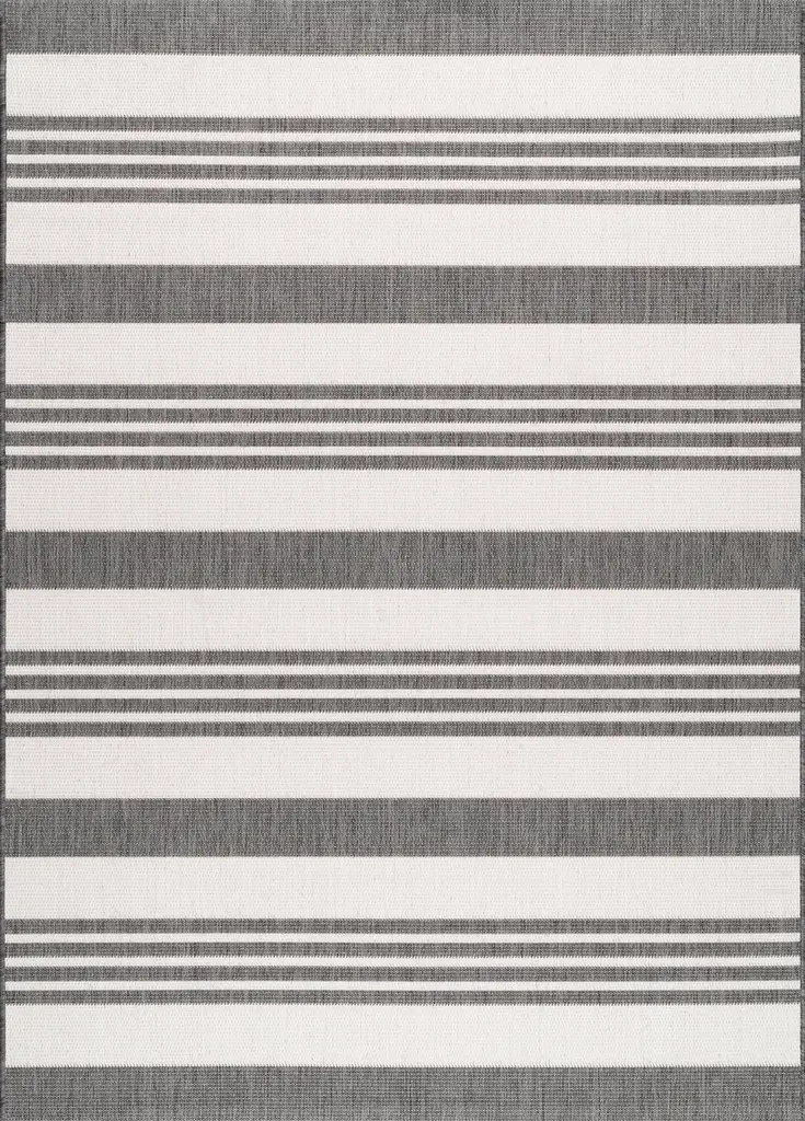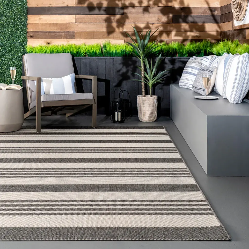 This striped area rug will be the finishing touch you''ve been looking! This floor covering can elevate your dining room or create a comforting environment on your patio. Made from durable synthetic fibers, this rug is built to last for years to come. Pair with nautical decor for a coastal feel, or farmhouse pieces for a rustic vibe. Kick back and relax with our pet-friendly and easy to care for area rugs.100% Polypropylene, made in BelgiumDesigned with resilience against everyday wear-and-tear, this rug is kid and pet friendly and perfect for high traffic areas both indoors and outdoors such as patio, living room, kitchen, and hallwaysSleek and functional .04" pile height allows for convenient placement in entryways, underneath furniture, and will not obstruct doorwaysWater resistant and easy to clean, this rug can be hosed down outside and spot treated for any mild stains using rug cleanerWe recommend using a rug pad to provide extra cushioning and to prevent any possible slipping and sliding on your flooring. Rug pads serve as protective layering piece for your floor and your rug from any wear and tear, extending the life of your rug
