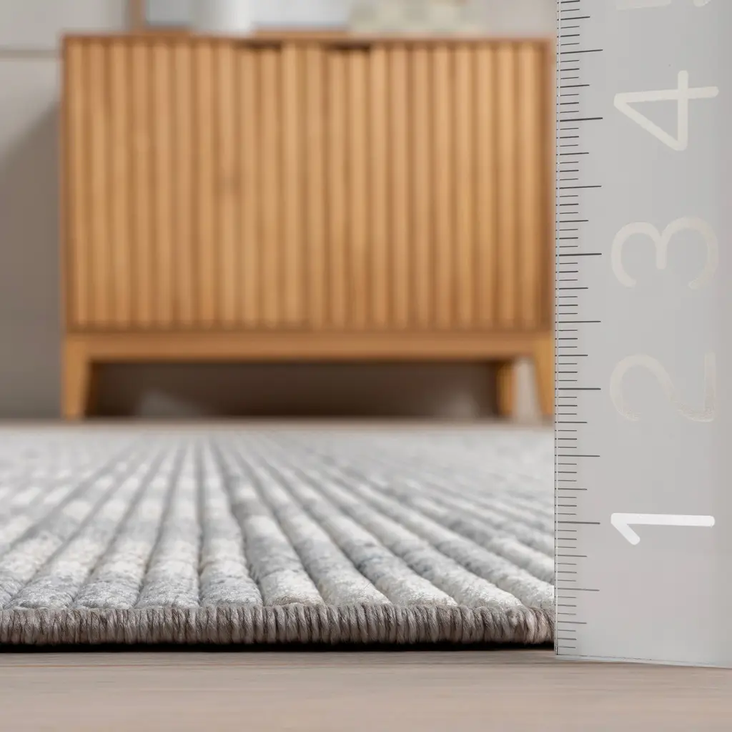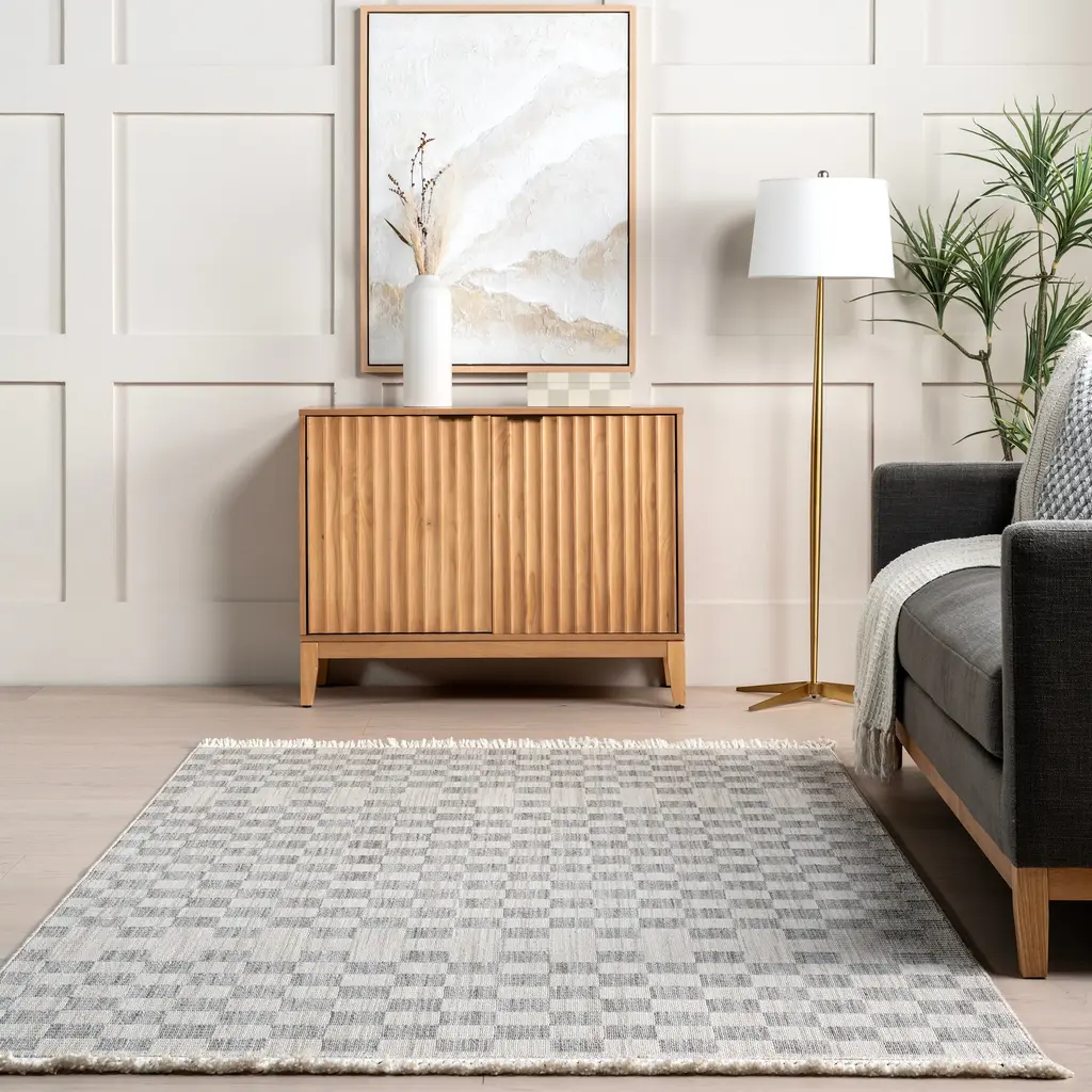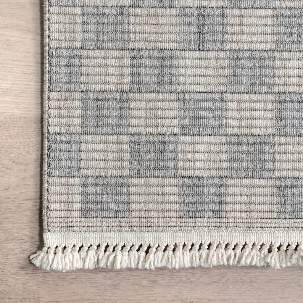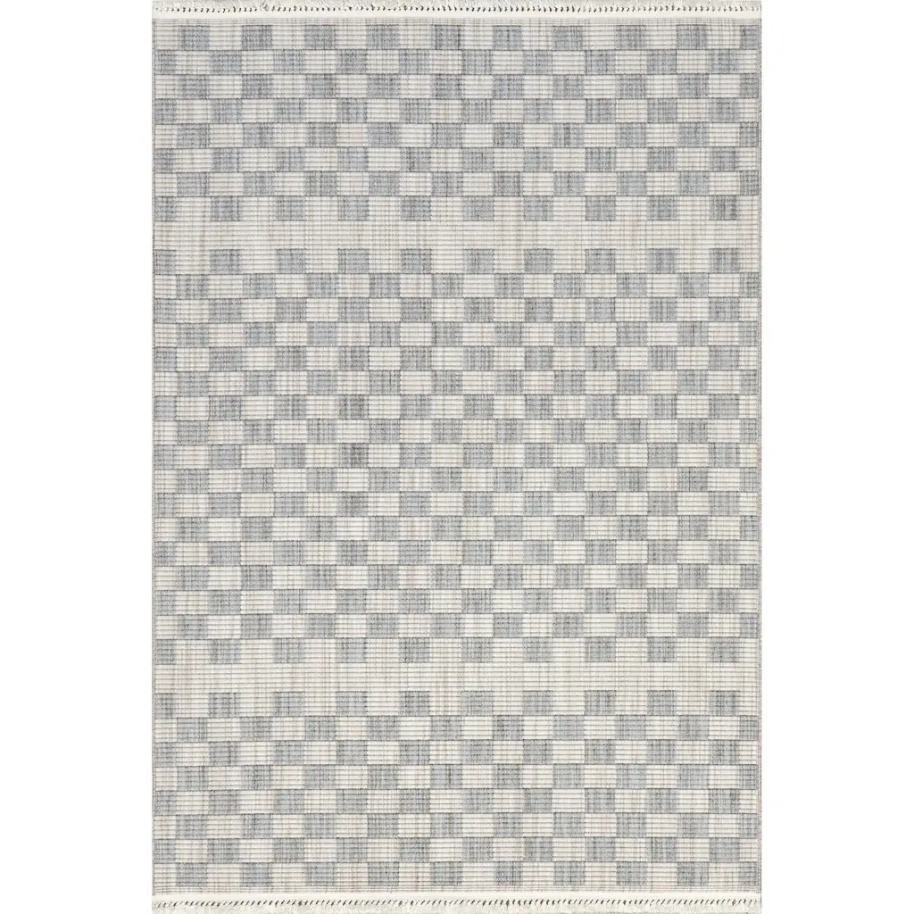 Indulge in timeless elegance with the geometric pattern of this rug, a hallmark of refined taste in any room. Delicately woven squares create a visually captivating design that effortlessly complements diverse decor styles. The pastel palette instills serenity, ideal for crafting a calm and inviting ambiance. What truly distinguishes this rug is its subtle luster, as carefully selected fibers offer a gentle sheen, adding an understated touch of sophistication. This slight shimmer enriches the rug's luxurious appearance, catching the eye and elevating the entire room. Tasseled ends further enhance its allure, infusing an extra layer of elegance and playfulness into the design.Features:100% Polyester, made in TurkeyDesigned with resilience against everyday wear and tear, this rug is kid and pet-friendly and perfect for your bedroom, living room, dining room, hallway, or kitchenSleek and functional .25" thickness allows for convenient placement in entryways and underneath furnitureEasy to care for, we recommend vacuuming regularly (avoiding tassels) to reduce potential shedding and spot cleaning any stains with carpet cleanerWe recommend using a rug pad to provide extra cushioning and to prevent any possible slipping and sliding on your flooring. Rug pads serve as protective layering piece for your floor and your rug from any wear and tear, extending the life of your rug.