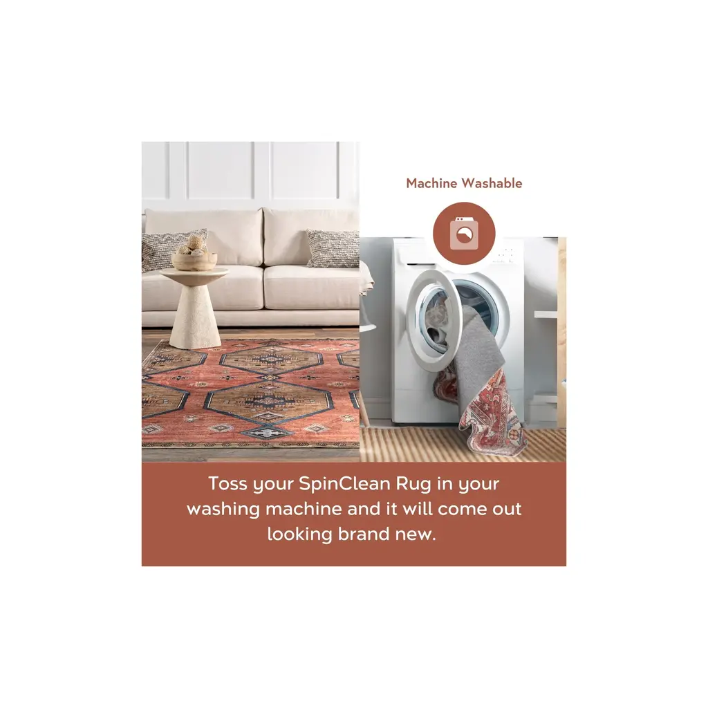 A rug you can't help but stop and stare! Perfect for a bedroom, living room, or any area needing an elevated look, this machine washable area rug features a fun an eye-catching pattern that will transform your space. Made from sustainably-sourced premium synthetic fibers, our machine-washable rugs are perfect for those with kids and pets. When that inevitable stain happens, roll your rug up and place it in your washing machine! Hang dry and simply put your rug right back in the desired place.53% Cotton, 29% Polyester, 18% Jute, made in TurkeySpill- and stain-resistant, this washable rug is perfect for those with kids and pets! Its durable machine woven weave will hold up in high traffic areas of your home such as your bedroom, living room, dining room, office, playroom, or hallwayMade from sustainably-sourced premium synthetic fibers with a .25" thickness that allows for convenient placement in entrways or under furnitureTo clean, machine wash with cold water using a standard-sized machine (do not use bleach). We recommend line drying or drying without heat on an air-only dryer cycle. A low heat iron can be used if neededWe recommend using a rug pad to provide extra cushioning and to prevent any possible slipping and sliding on your flooring. Rug pads serve as protective layering piece for your floor and your rug from any wear and tear, extending the life of your rug.Vacuum carefully without beater bar at lowest setting. Machine wash in cold water. Gentle cycle. Do not use bleach. Line dry. Low heat iron when needed.