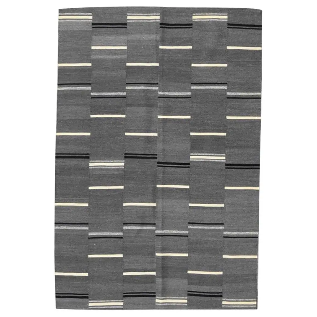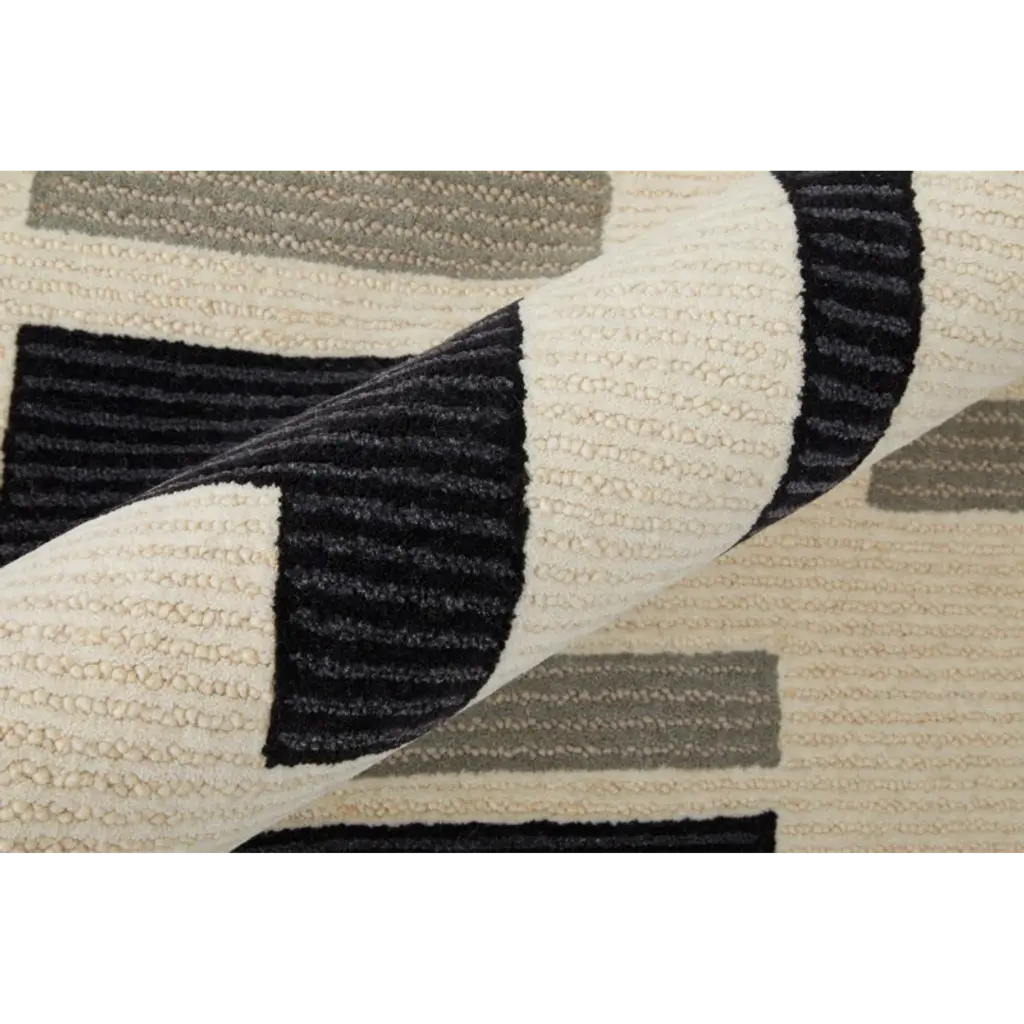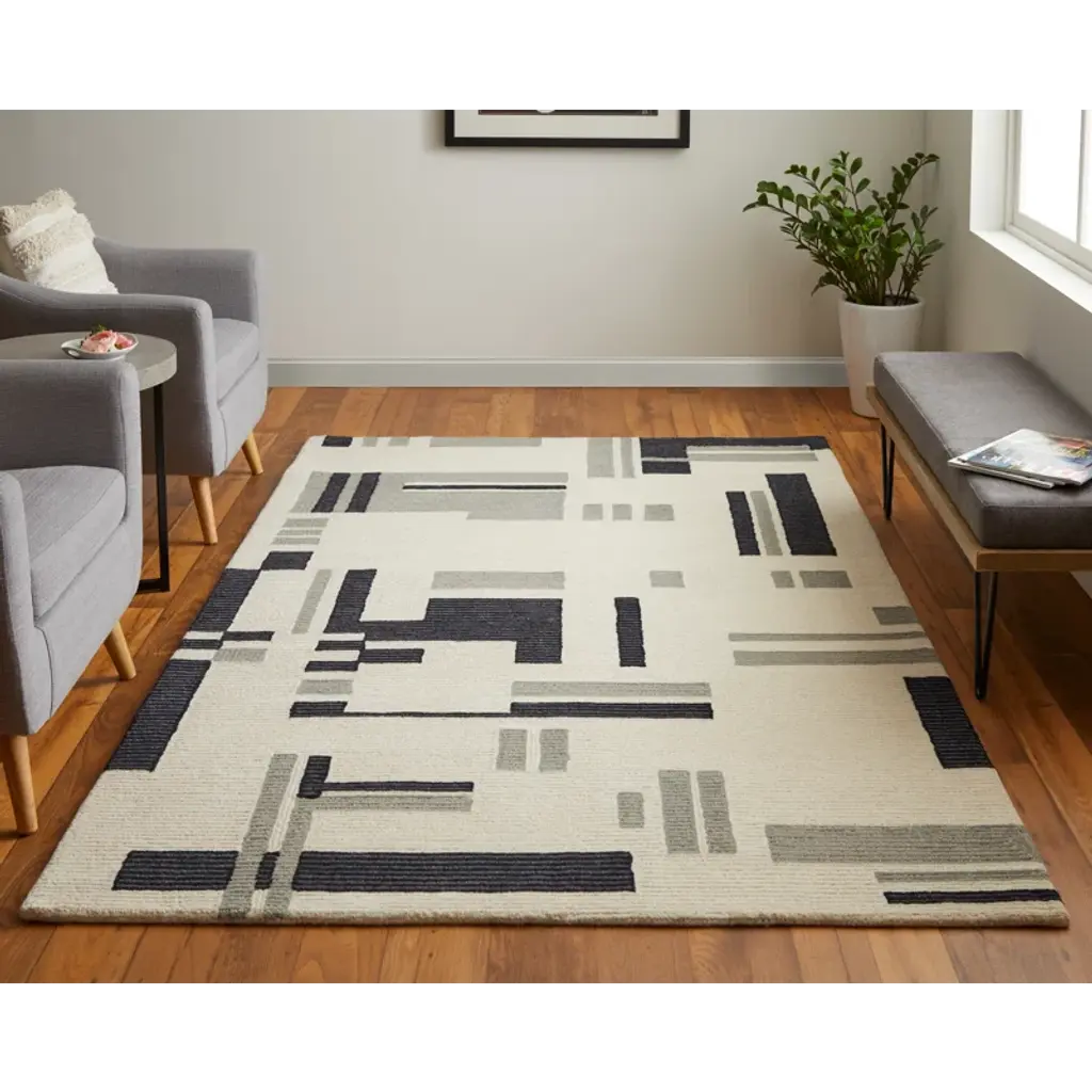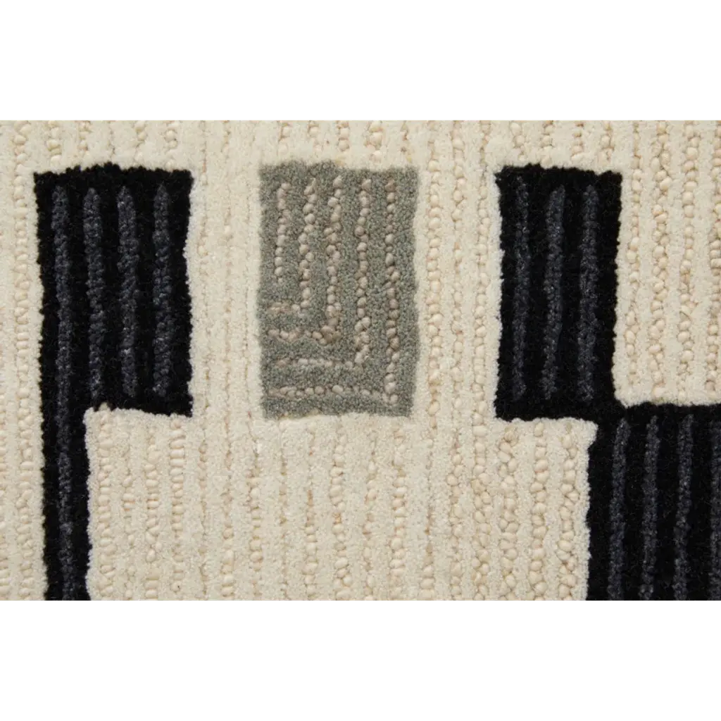 Hand-tufted in India of wool and nylon, the Nya collection features striking geometric patterns and high-contrast colors of ivory and black. The graphic element woven into the area rug brings a bold and modern feel to any room. The wool allows for stain, water, and fade resistance. The fiber of the rug allows easy care, can handle high traffic, and is pet friendly. This conversation-starting piece will look great in any space you might host in.