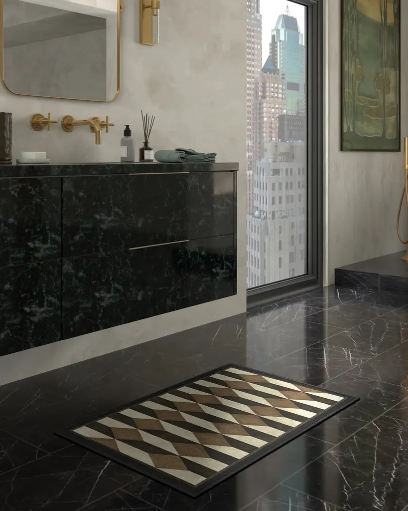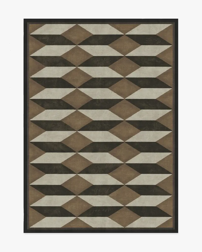 Bring home celebrity style made for you with our Martyn Lawrence Bullard Oak Black & Camel Rug. Reminiscent of Italian architect Gio Ponti's iconic tile designs, this symmetrical design features a captivating pattern of trapezoids that shift from warm black to marbled cream, all set against a rustic, camel gold background. The simple yet stylish border enhances the overall optical effect, creating a striking visual centerpiece for any room. Water-resistant, stain-resistant, and machine-washable. Rug colors may vary slightly according to your device and the lighting in your space.