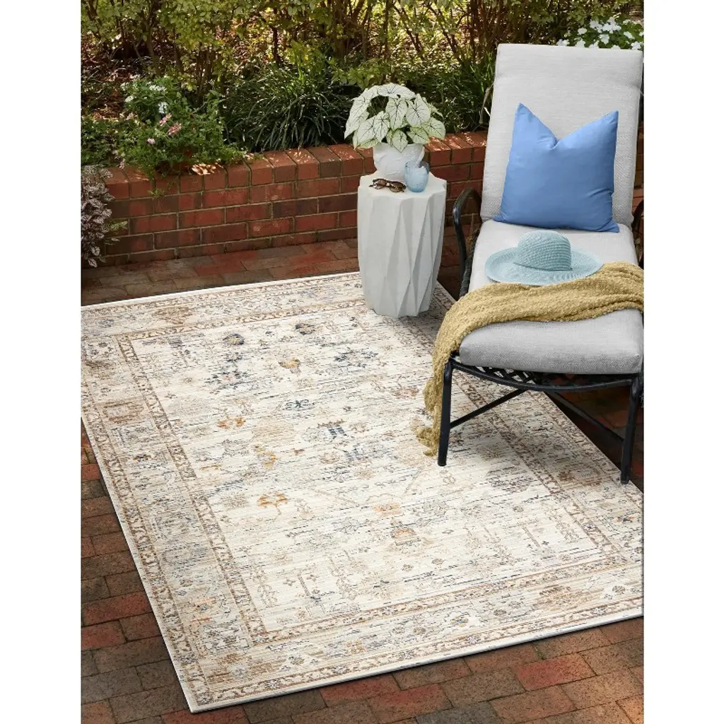 Refresh your home with this sleek, machine-made, and power-loomed indoor and outdoor area rug. Its elegant creamy tone and barely there pile height of 1/8 inch make it perfect for any high-traffic area of your home, from entryway to office, or patio to pool and anything in between. Plus it's made of a durable and comfortable 100% Polypropylene. Rotate the rug periodically for even wear, vacuum at the lowest setting without a beater bar, and spot clean with a dry cloth or mild detergent for easy cleaning.