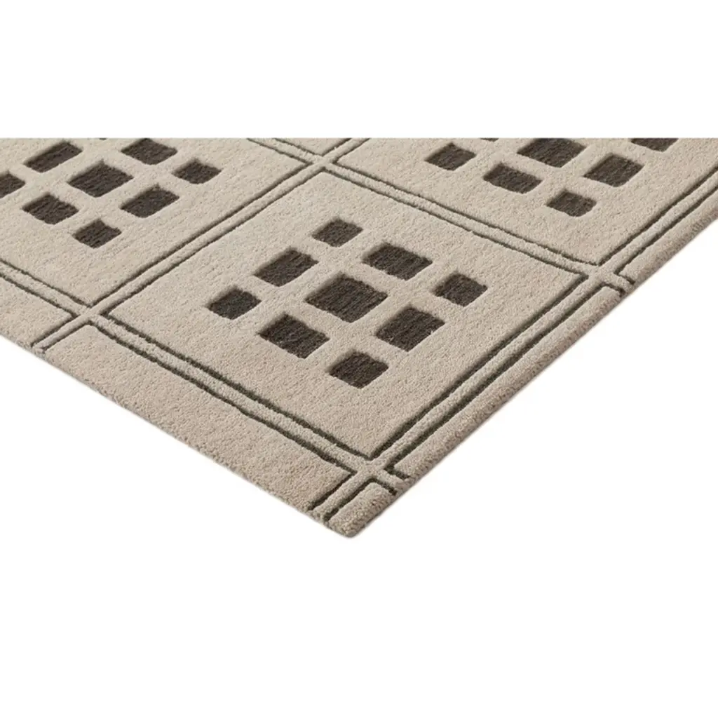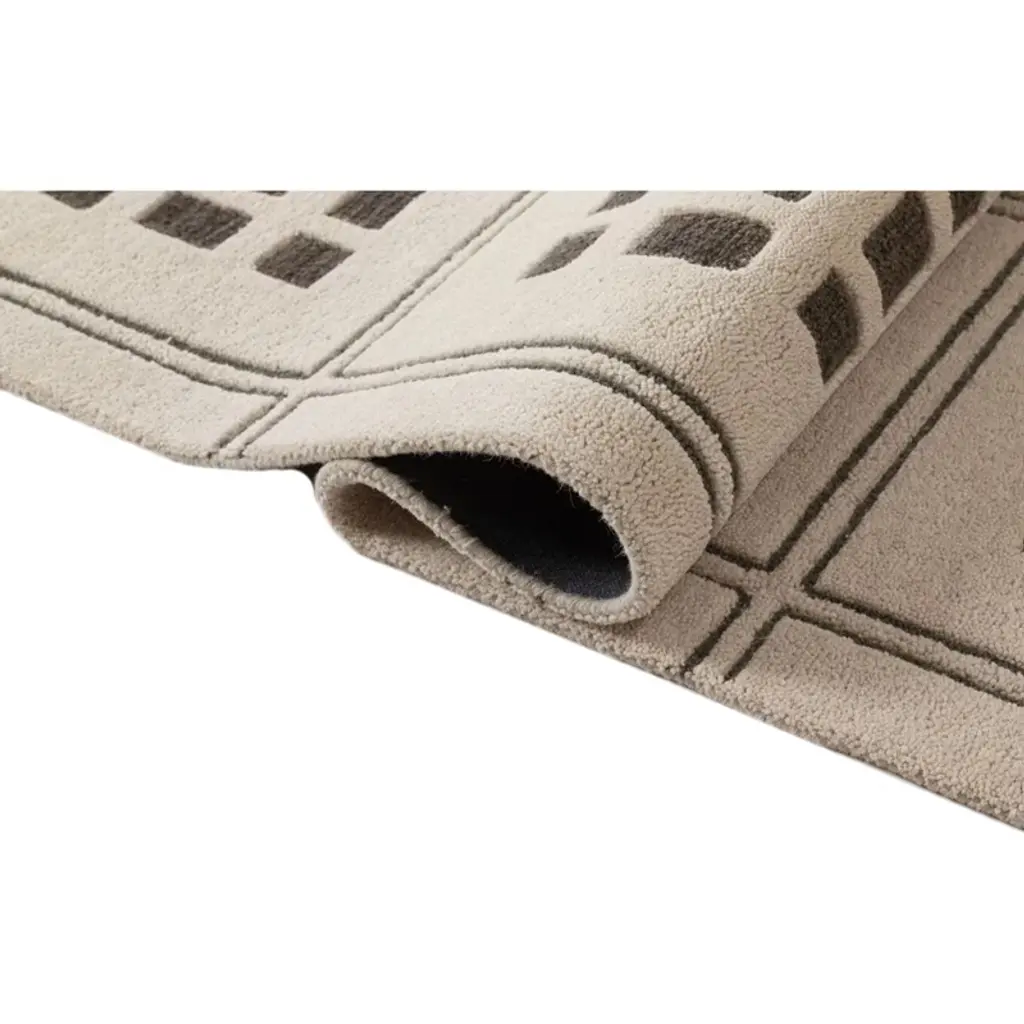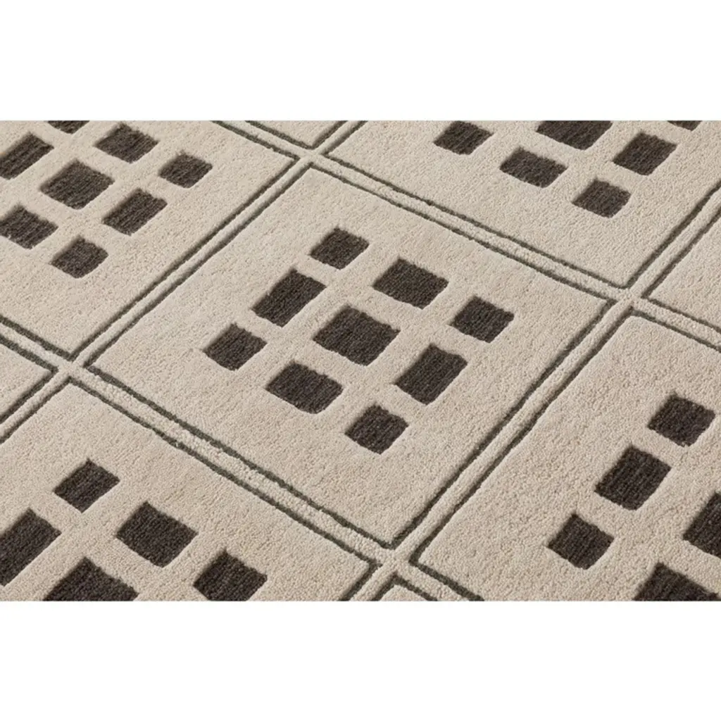 This hand-tufted wool rug features a structured grid pattern with a contemporary twist, making it a bold statement piece for modern interiors. The cream-colored base is accented with charcoal geometric detailing, creating a clean, architectural look. Crafted from 100% wool, this rug provides a soft yet durable texture, offering both comfort and longevity. The cut-and-loop pile enhances dimension, while the minimalist design ensures versatility across different spaces.