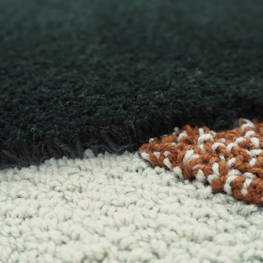 This unique rug is a splendid example of the combination of traditional craftsmanship and contemporary sensibility. The result is a modern and sophisticated piece that can be displayed alone or combined with the other pieces from the OCI collection (a word that in Venetian means "eyes" and it is also used to refer to buildings' windows). A color block decoration graces the elongated hexagon of the rug's silhouette featuring mint green mixed in with dark and light brown. Custom measurements available. Please ask the concierge.