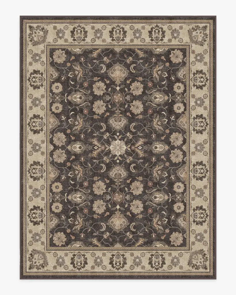 Feminine florals fuse with rustic browns in our Odette Dark Wood Rug. The antique-inspired design takes inspiration from European patterns in rustic shades of brown and black contrasted with regal pops of gold, coral, beige, and taupe.