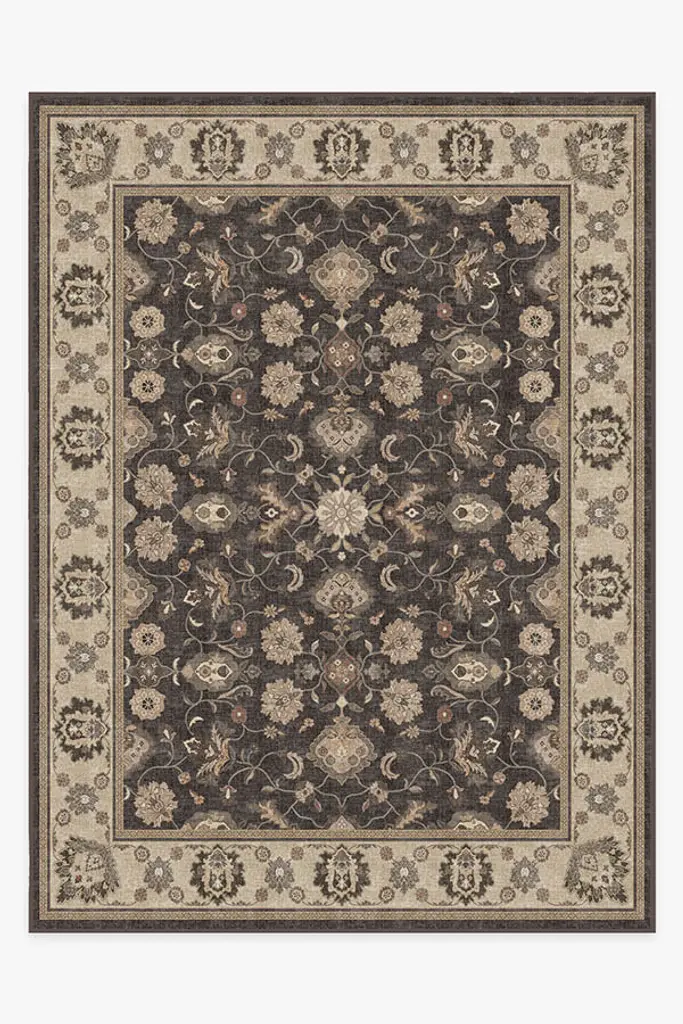 Feminine florals fuse with rustic browns in our Odette Dark Wood Rug. The antique-inspired design takes inspiration from European patterns in rustic shades of brown and black contrasted with regal pops of gold, coral, beige, and taupe. Water-resistant, stain-resistant, and machine-washable.