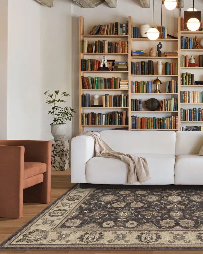Feminine florals fuse with rustic browns in our Odette Dark Wood Rug. The antique-inspired design takes inspiration from European patterns in rustic shades of brown and black contrasted with regal pops of gold, coral, beige, and taupe. Water-resistant, stain-resistant, and machine-washable.