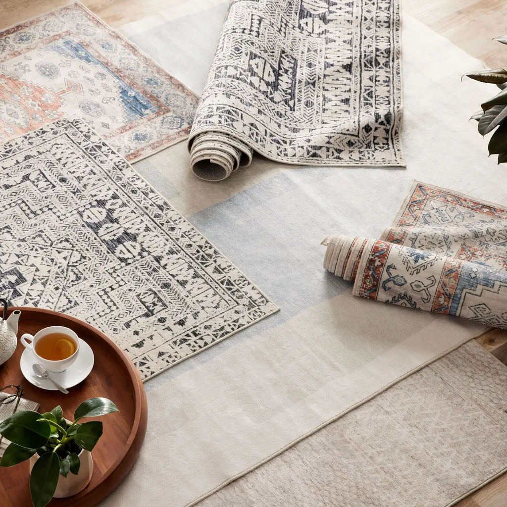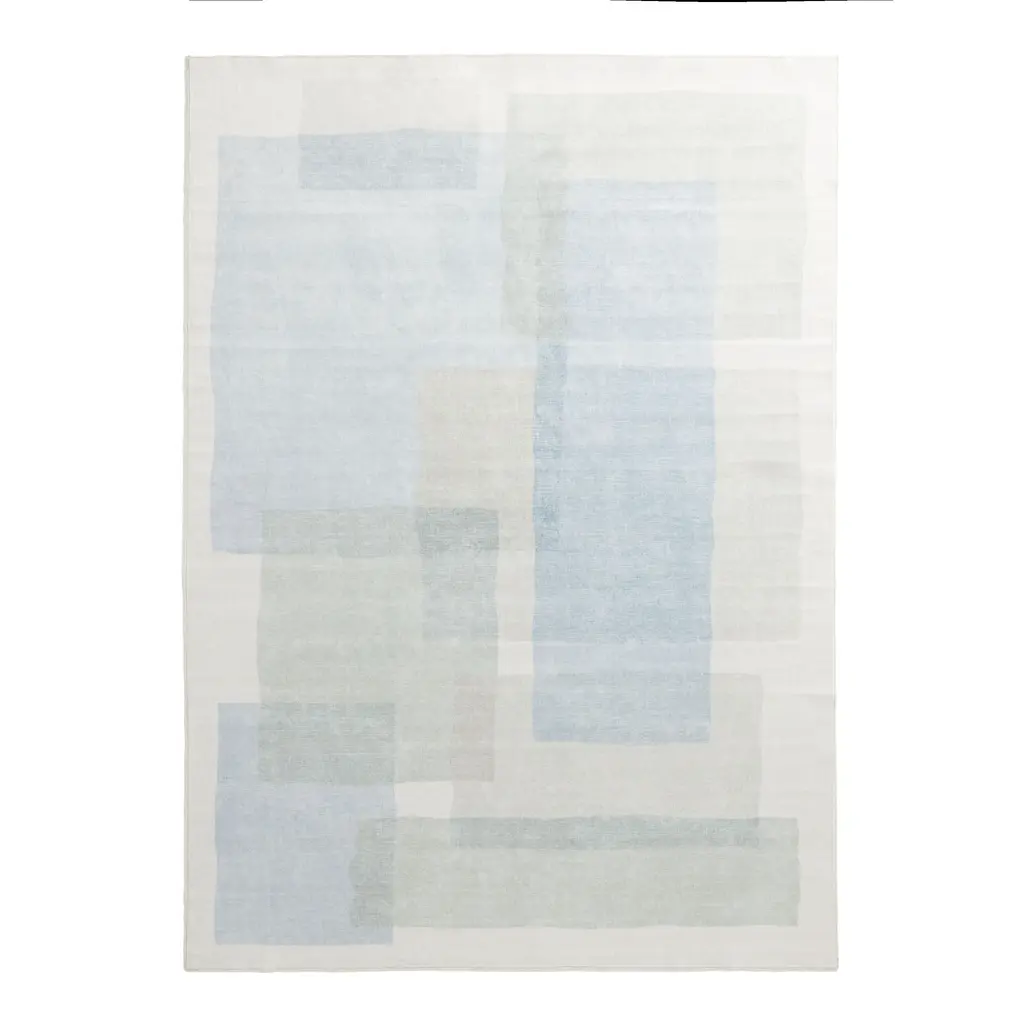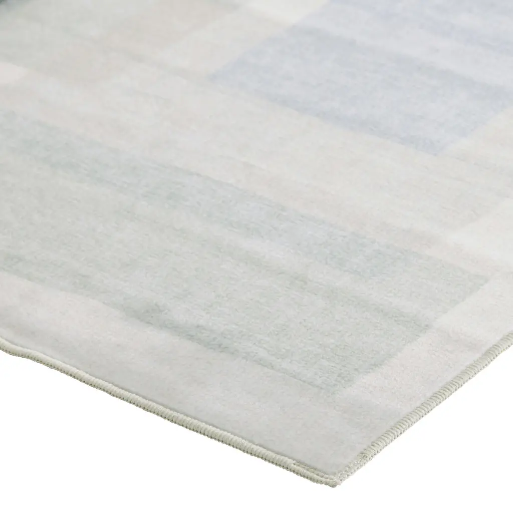 Our supremely plush Olin machine-washable area rug layers an abstract modern design in muted blue, tan and green hues over an elegant ivory background. The minimalist beauty of its color-blocked artistry bring versatile transitional style to high-traffic areas. Presented in an array of sizes to bridge traditional and contemporary spaces, this washable foundation maintains its low-pile durability through heavy foot traffic.