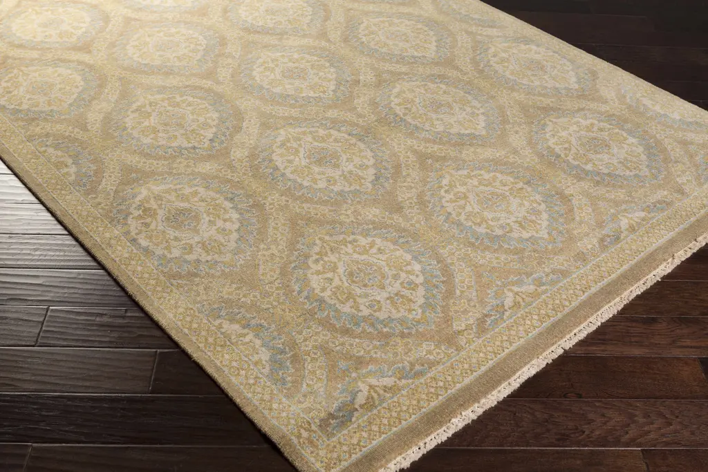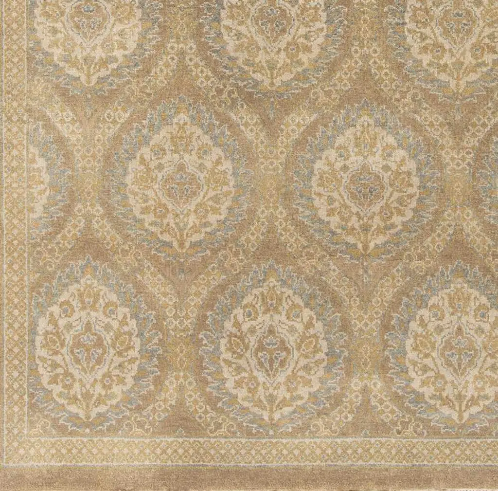 Collection: Olson Colors: Tan, Beige, Pale Blue, Ice Blue, Peach Construction: Hand Knotted Pile: Medium Pile Pile Height: 0.4" Made In: India Price Range: $$$$$ (Premium)