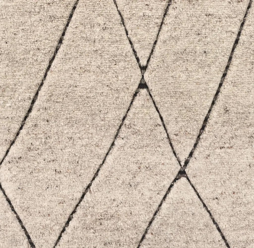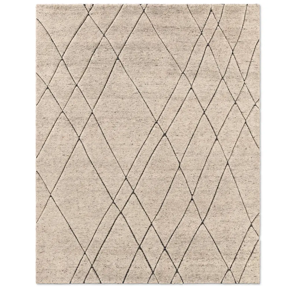 Omala's hand-knotted pile reveals the natural variation of undyed New Zealand wool. Artisans carve asymmetrical diamonds into the pile, imparting high-low dimension to the chunky, hand-spun yarns.