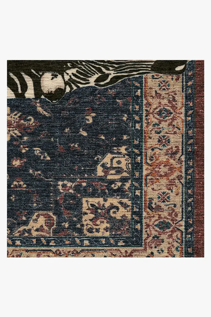 Dare to be different. Our Iris Apfel On Safari Sapphire Rug features an intricate Persian-inspired design layered with large animal imagery for a sense of sophisticated eclecticism. The bold royal blues and rich reds of the detailed background are reminiscent of traditional home colors, which stand out against the colors of the black and white zebra. Water-resistant, stain-resistant, and machine-washable.