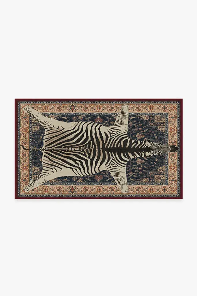 Dare to be different. Our Iris Apfel On Safari Sapphire Rug features an intricate Persian-inspired design layered with large animal imagery for a sense of sophisticated eclecticism. The bold royal blues and rich reds of the detailed background are reminiscent of traditional home colors, which stand out against the colors of the black and white zebra. Water-resistant, stain-resistant, and machine-washable.