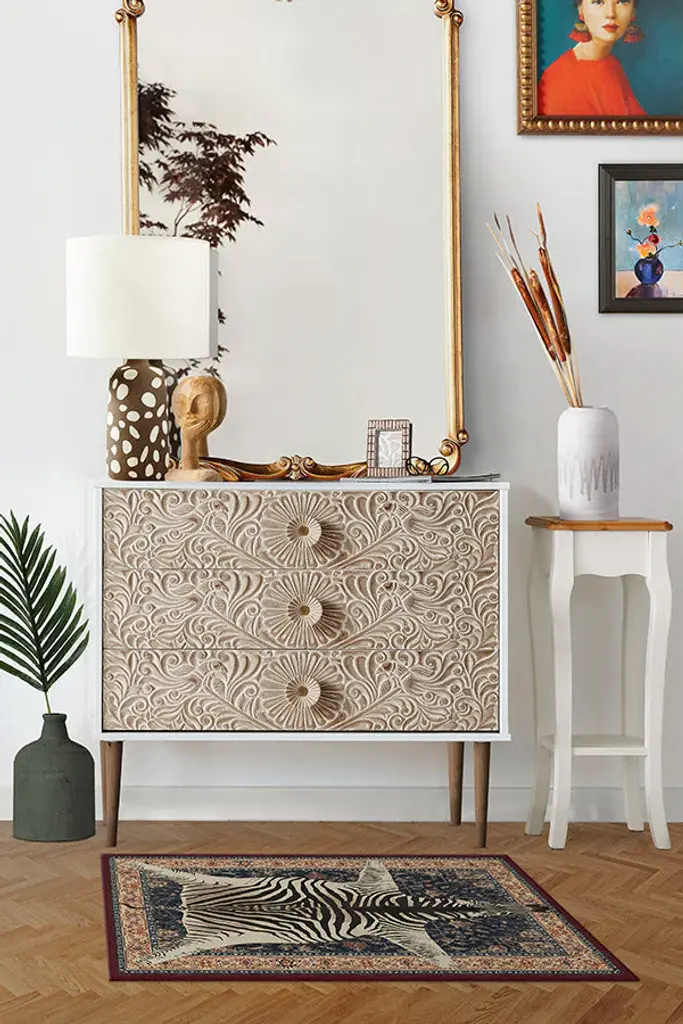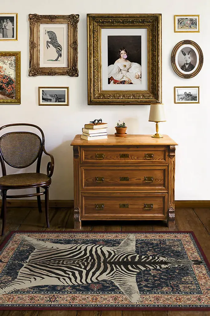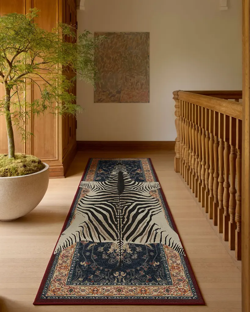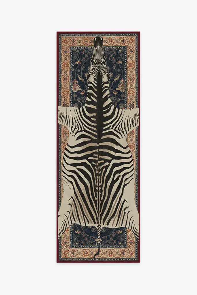 Dare to be different. Our Iris Apfel On Safari Sapphire Rug features an intricate Persian-inspired design layered with large animal imagery for a sense of sophisticated eclecticism. The bold royal blues and rich reds of the detailed background are reminiscent of traditional home colors, which stand out against the colors of the black and white zebra. Water-resistant, stain-resistant, and machine-washable.
