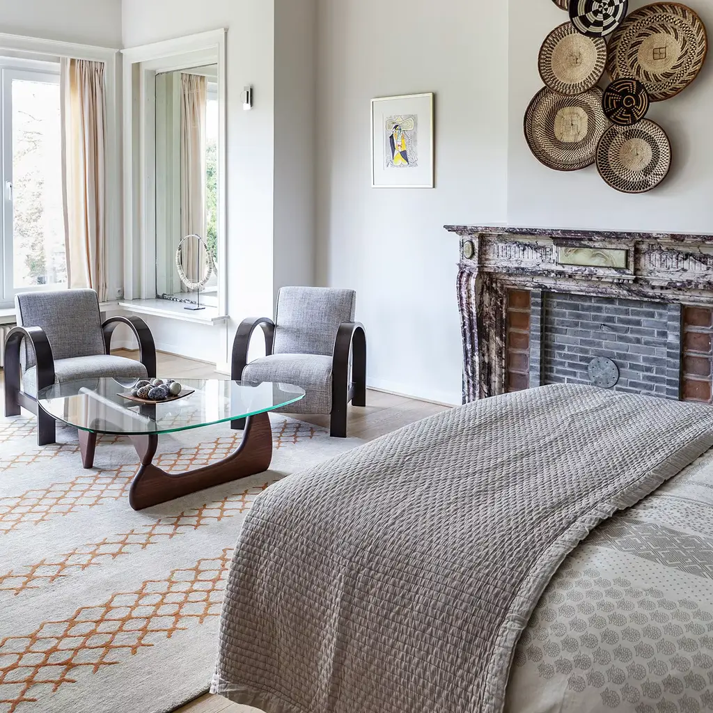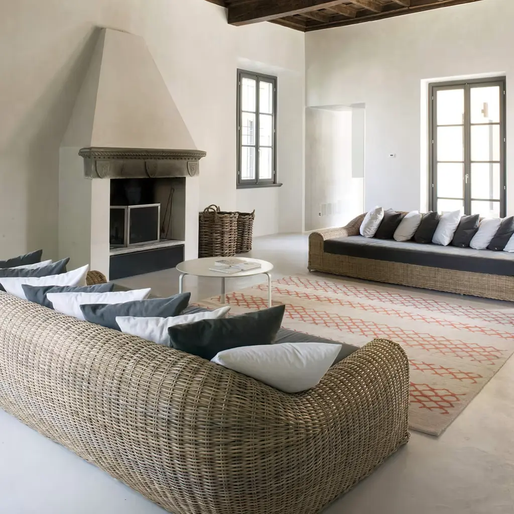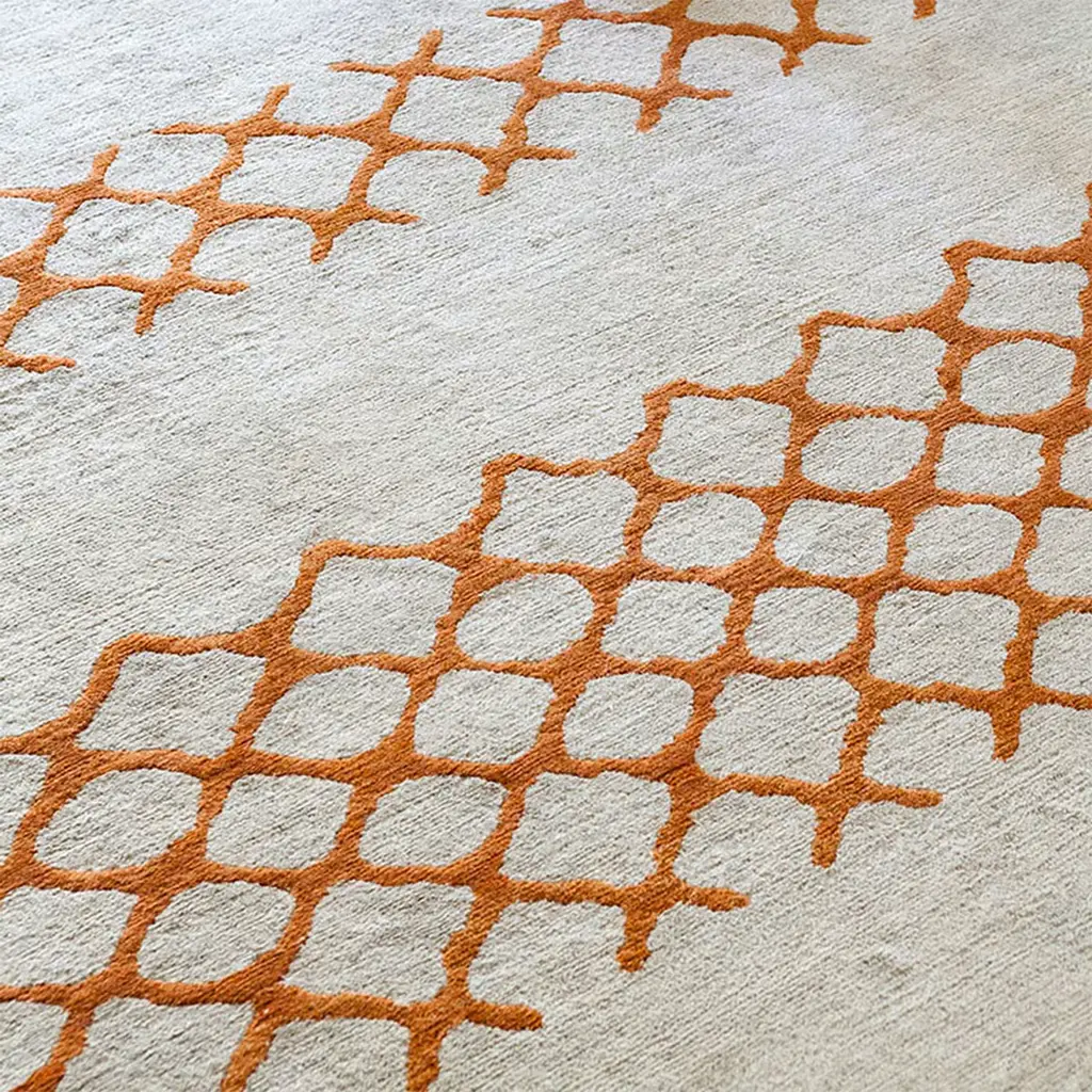 This exquisite rug features a warm, delicate color combination that will brighten up any room, particularly among a contemporary decor. This piece was hand knotted in Nepal and its 100 knots are made with a blend of wool and linen that create rows of orange oval-shaped decorations running horizontally, alternating with the light beige background. Standard sizes: 170x240, 200x250, 200x300, 220x300, 250x300, 250x350, 300x400, 350x420, 350 x500, 400x600 cm and 250x250, 300x300, 400x400 cm. Customization is available.