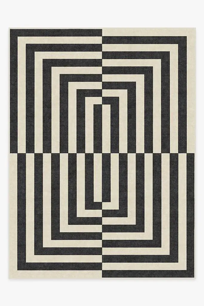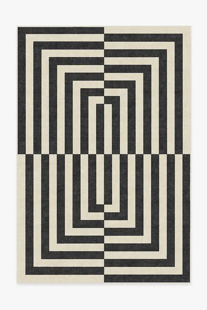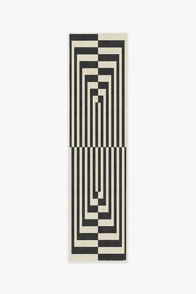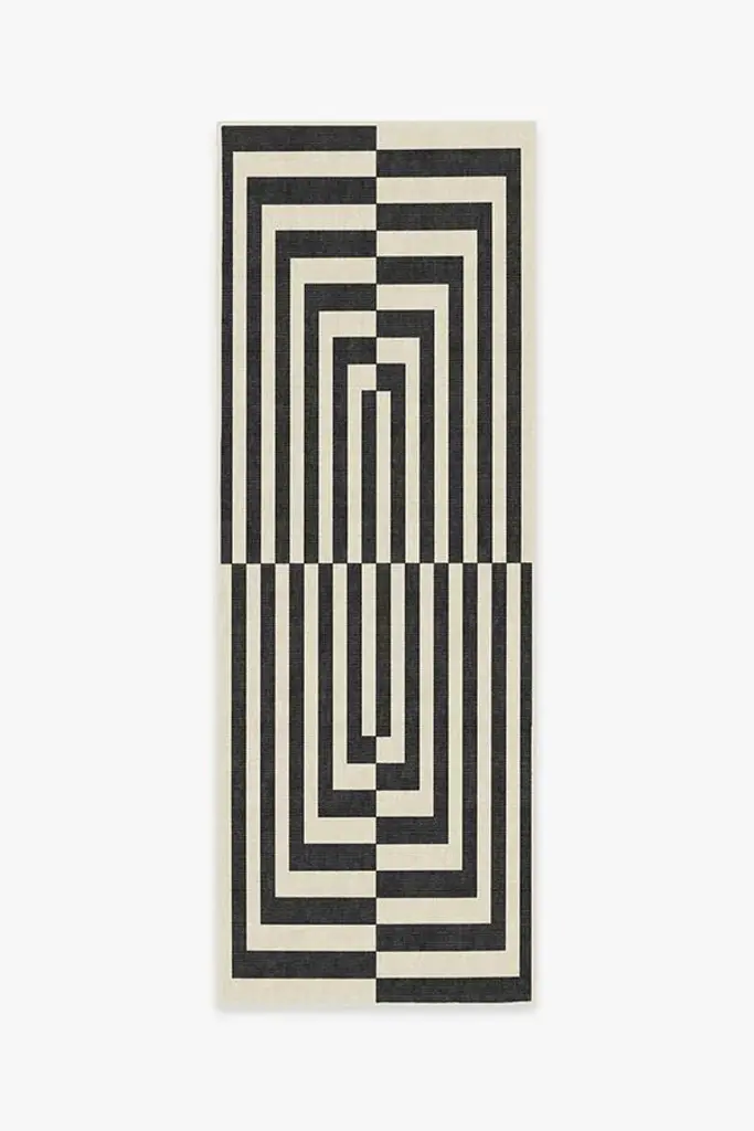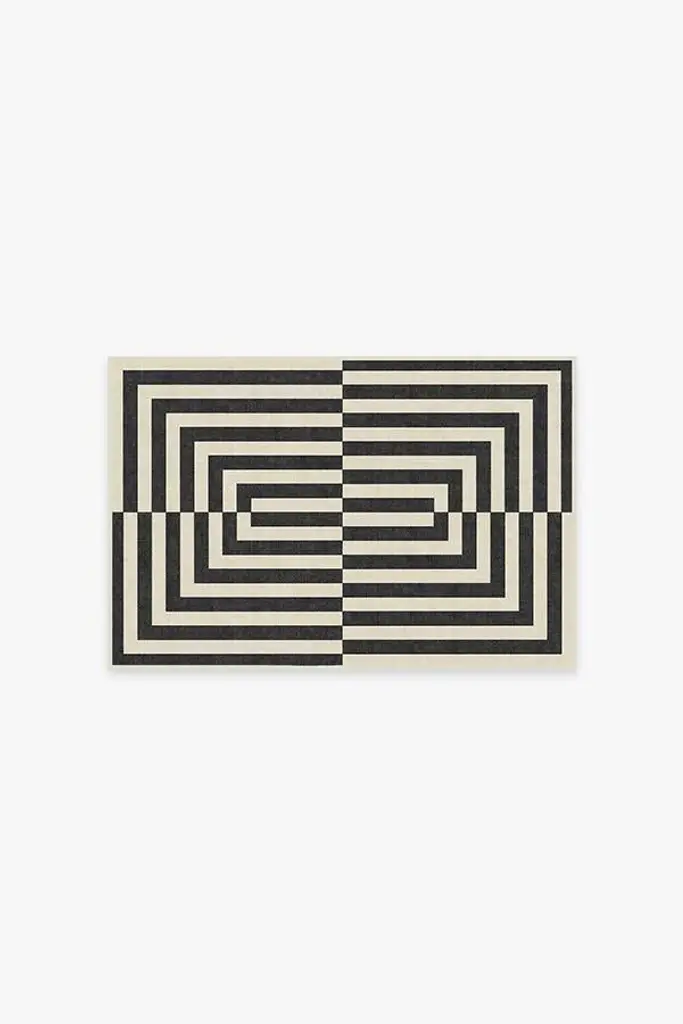 Graphic go-anywhere funster. This charcoal and off-white geometric rug mesmerizes with its dynamic, op art-inspired pattern. Water-resistant, stain-resistant, and machine-washable.